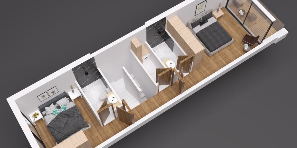 The complex consists of 20 modern design maisonettes. All properties consist of an open plan kitchen and living room, 1 main bathroom, 1 ensuite, 1 toilet and a laundry room. Clients have the option of adding a roof garden with private BBQ area.