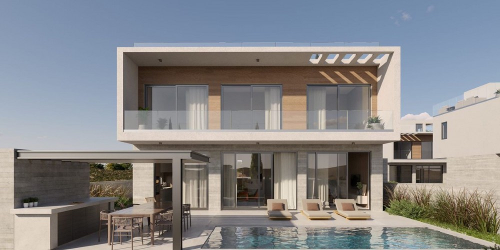 The villas have a warm Mediterranean style with wood detailing on the exterior. Inside, they are spacious, elegant, and finished with VRV cooling systems and underfloor heating, keepi...