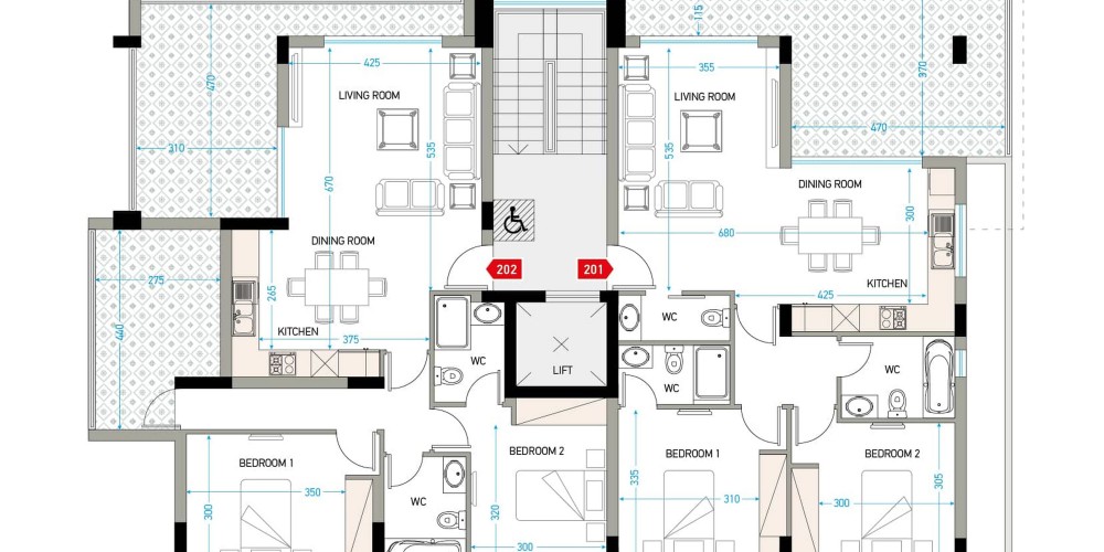 The development consists of six apartments with 2 bedrooms including the penthouses with private roof terrace.