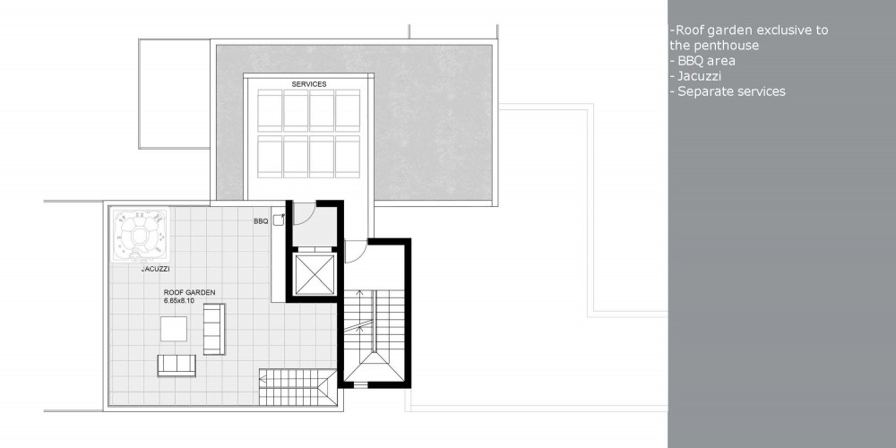 The development consists of 2 bedroom apartments and the fourth floor is occupied by a three bedroom penthouse with the private access to the roof garden, which includes a BBQ and sitting area and an outdoor jacuzzi for an additional cost.