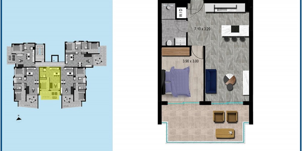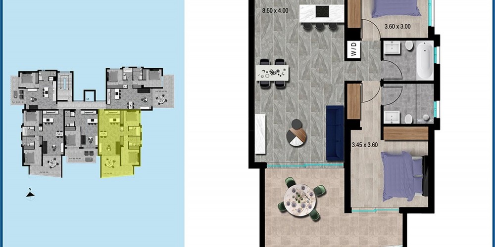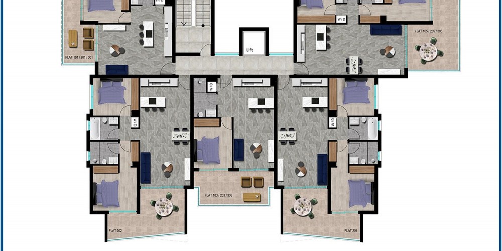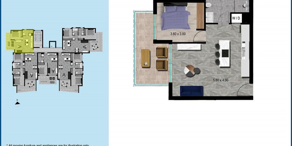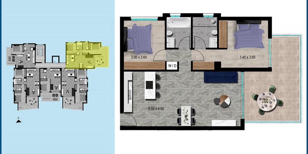 All apartments have a modern concept with a large open layout, custom-made kitchen cabinets, built-in wardrobes, large double-glazing windows and much more.