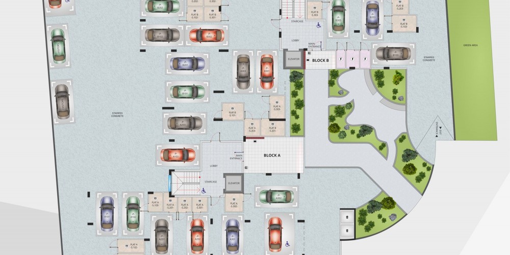 The two blocks consist of apartments with spacious and contemporary living areas. There are three apartments per floor. The two third floor apartments benefit from individual private roof gardens with panoramic views. Each apartment has assigned one parking space and a storage room on the ground level.