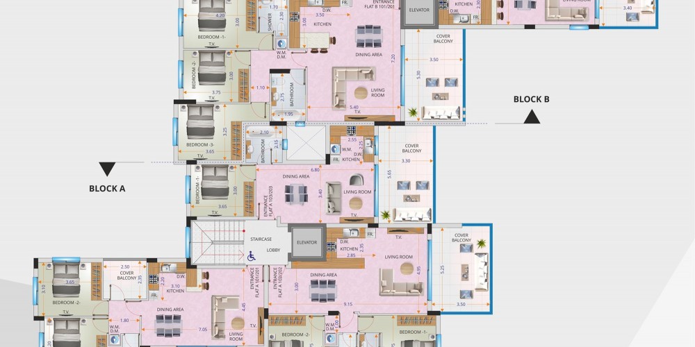 The two blocks consist of apartments with spacious and contemporary living areas. There are three apartments per floor. The two third floor apartments benefit from individual private roof gardens with panoramic views....