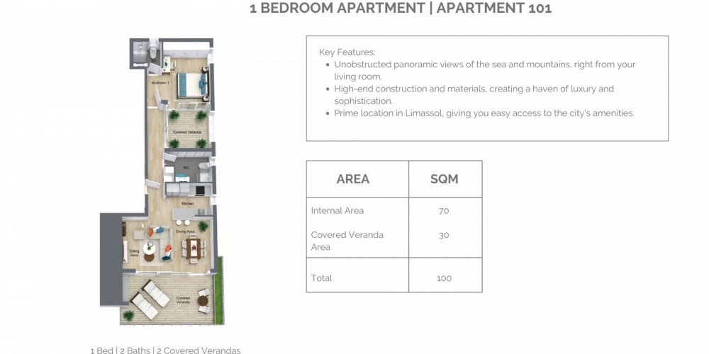 The project is located in the heart of Limassol. The development features four floors with 1 and 2-bedroom apartments, as well as a three bedroom penthouse on the fourth floor.