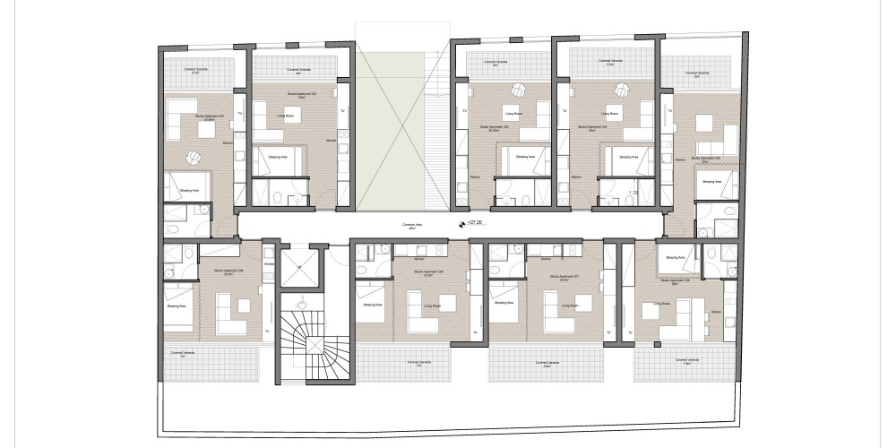 The development will consist of 25 studio type apartments. On the first floor, the lobby will be located which is a muti-purpose area for all residents for relaxing, reading, working or simply chilling-out. The studios will have an open plan kitchen, living and sleeping area.
