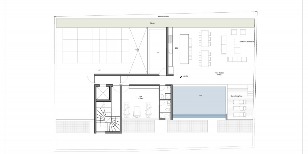 On the forth floor, the roof garden has all the facilities you need for relaxation: an overflow swimming pool with sunbathing area, barbeque and an outdoor cinema wall.