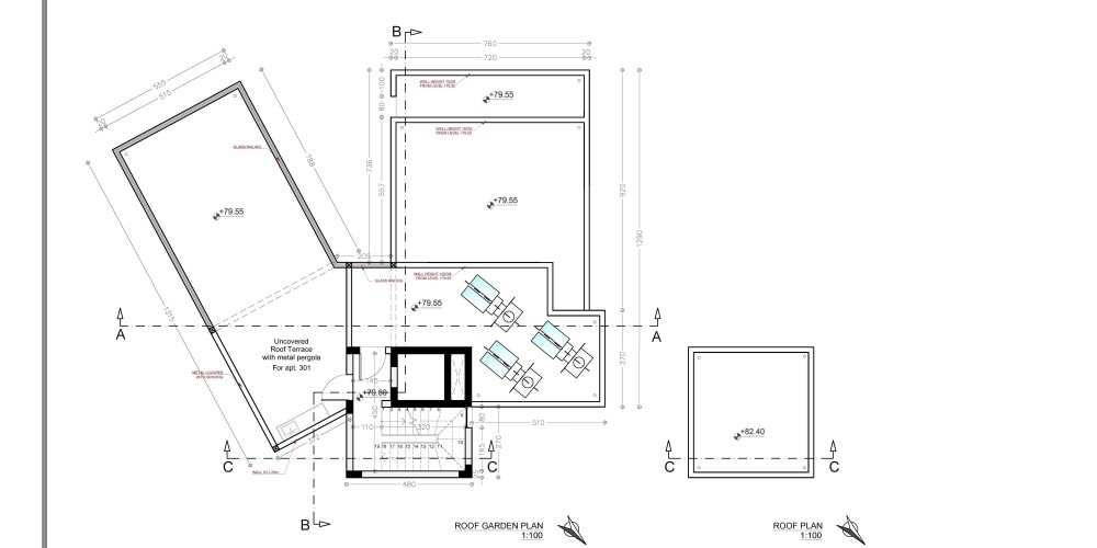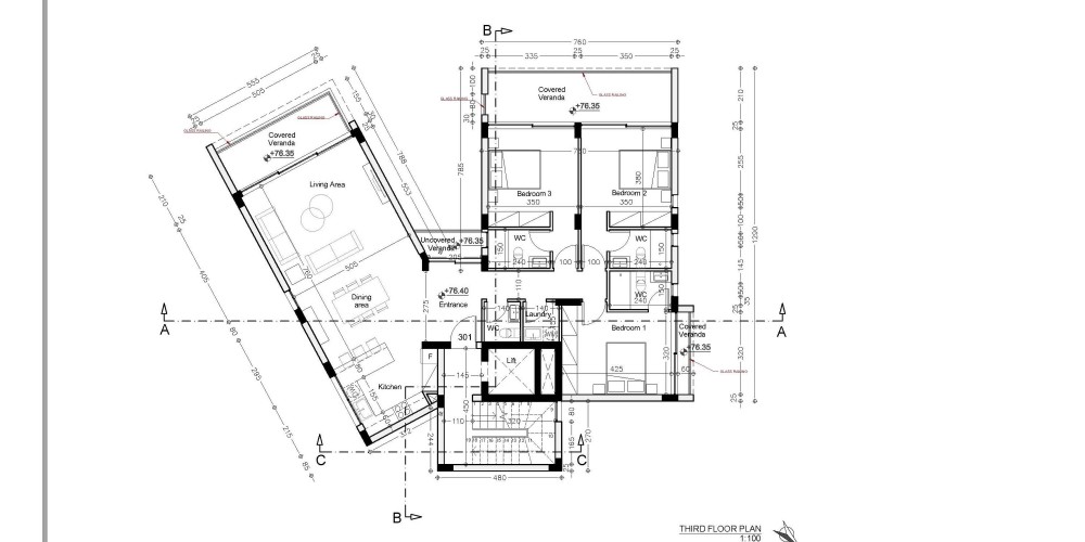 The building’s modern lines and V-shape top view provide a unique character on its looks. There are 3 floors in total, each one with one 3 bedroom apartment. The indoors of each apartment are very spacious, with an open plan space between the kitchen, dining area and living area. All bedrooms have en-suite WC and bathroom and have access to a covered veranda. All apartments are identical in layout apart from the penthouse which enjoys a large uncovered and semi covered roof terrace. Each apartment is complemented with a laundry room, guest WC, covered parking and storage area.