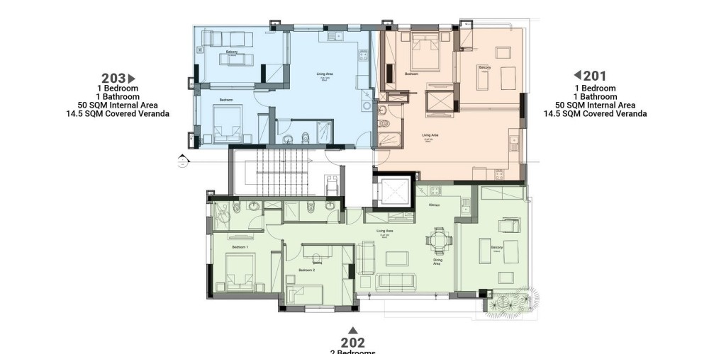 Each apartment will be able to enjoy the panoramic views of the neighbourhood from their verandas. The top floor apartments will also have covered and uncovered roof terraces.
