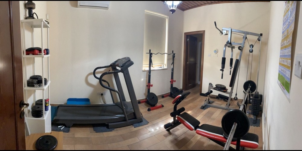 On the ground floor, the villa boasts a well-appointed kitchen, a spacious living room, 2 guest WCs for utmost convenience, an office space for work or study, and a secondary kitchen. Additional features include 2 storage spaces, a cozy fireplace, and a gym area with a shower.
