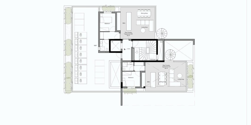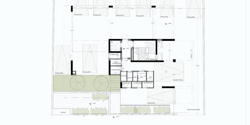 The building incorporates green spaces on each floor. Additionally, parking is available on the ground floor for residents' convenience.