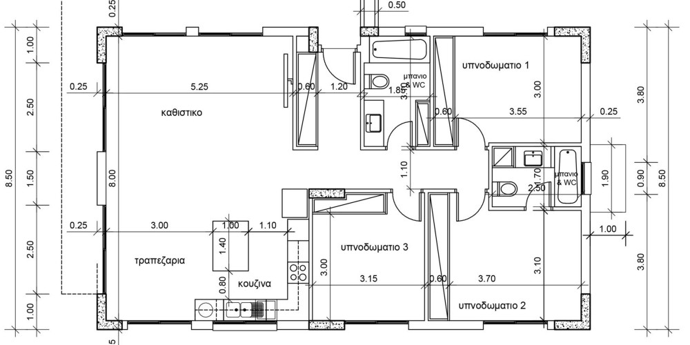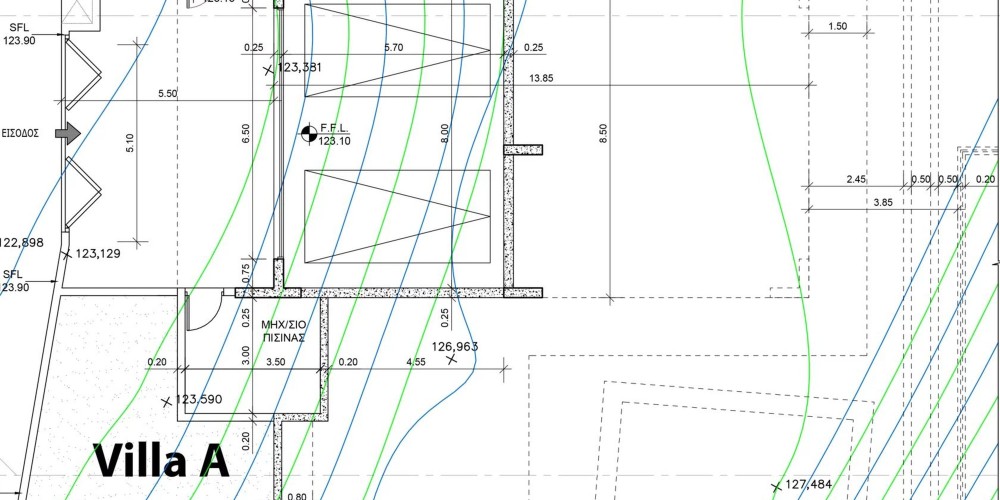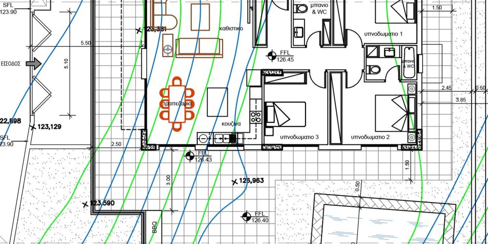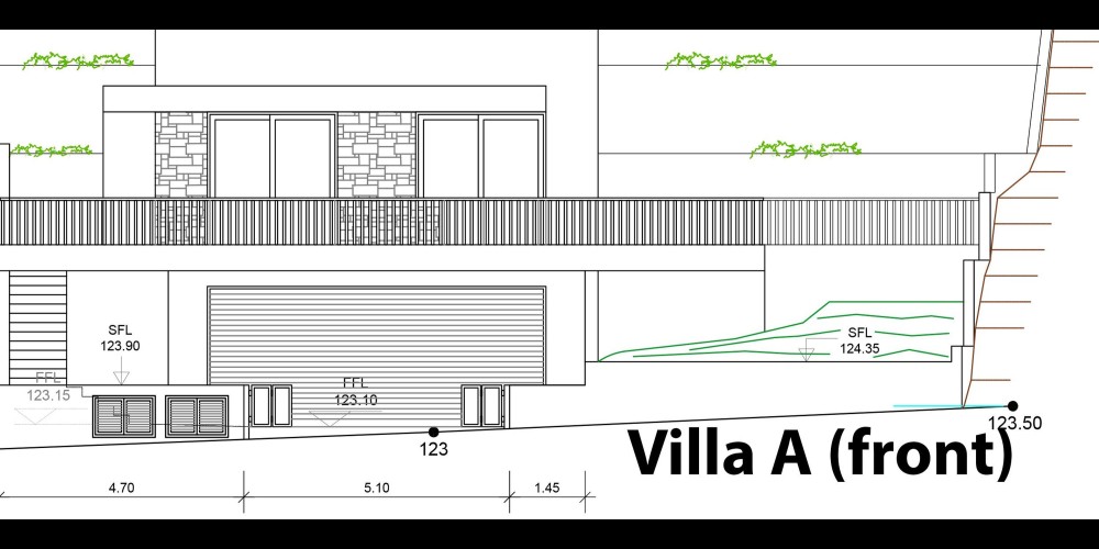 The villa will have 3 bedrooms. The biggest room is combined with the kitchen-living room. The garages and a maintenance room are located on the basement level.