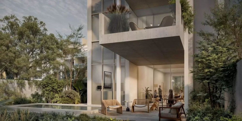 The project’s focus is on privacy and comfort within the landscaped grounds of a secured community, enhanced with a heated outdoor pool for year-round use.
