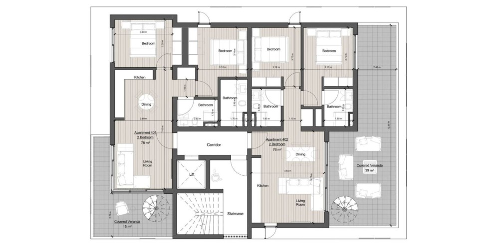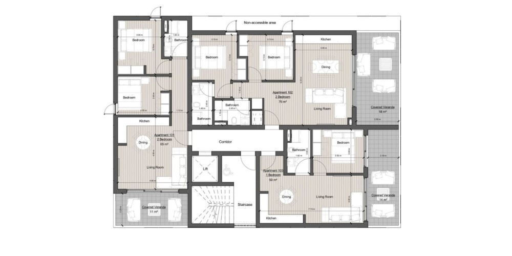 Each apartment features spacious interiors, 1 or 2 bathrooms and high quality finishes. Private parking is also provided for each apartment.