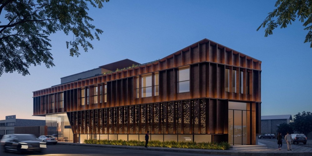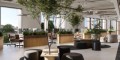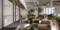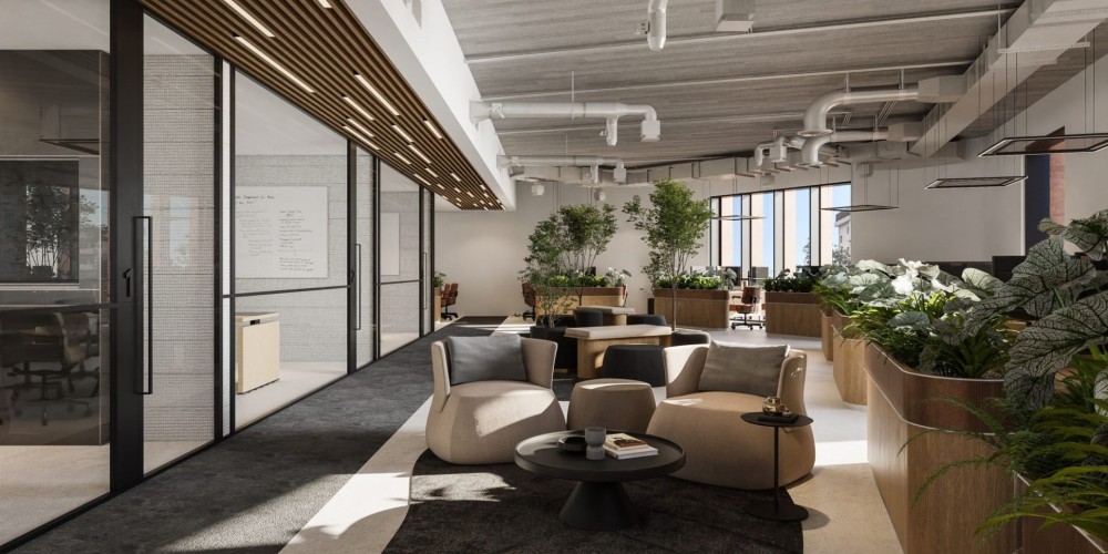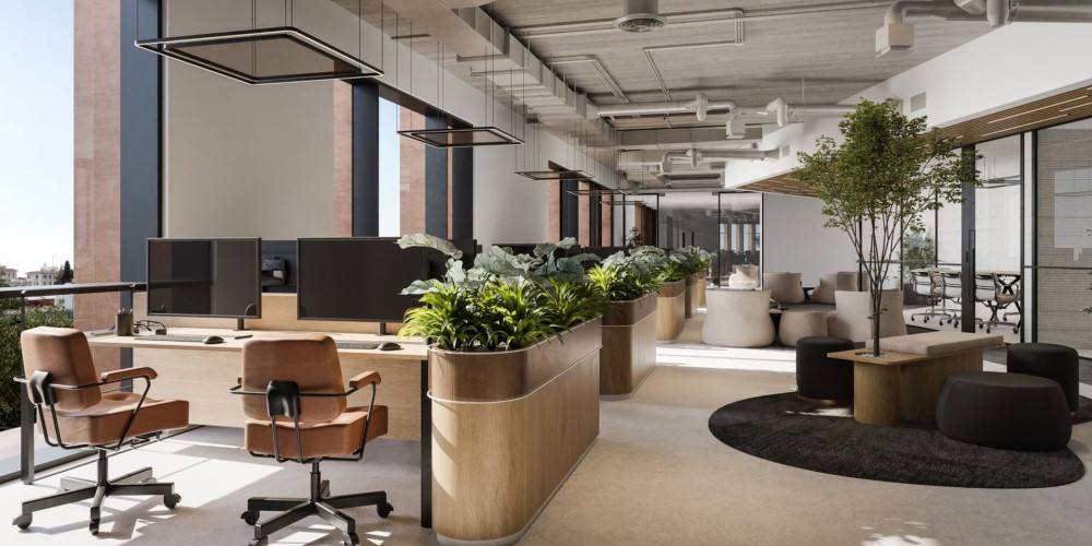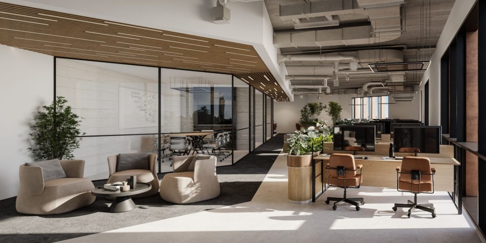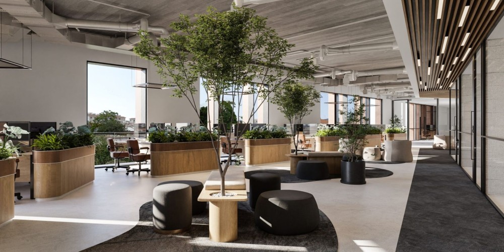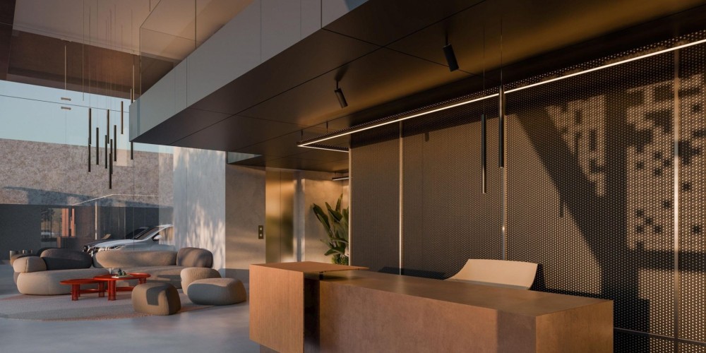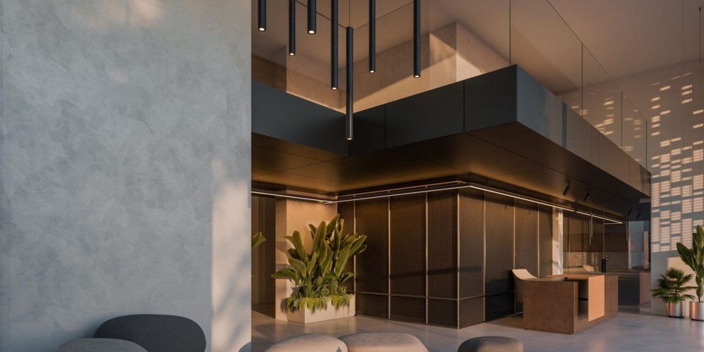 The interior continues the theme of refined modernity, complemented by touches of greenery that promote a tranquil atmosphere. The expansive windows ensure ample natural light. The building features multiple entrances to accommodate a range of business operations, with a rooftop garden that provides space for leisure and corporate events.