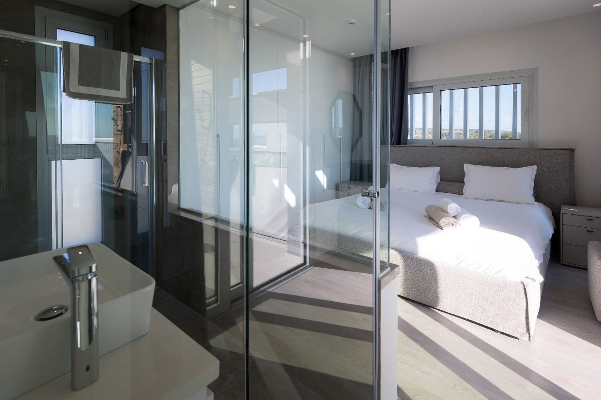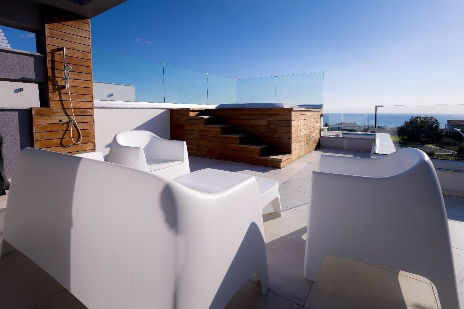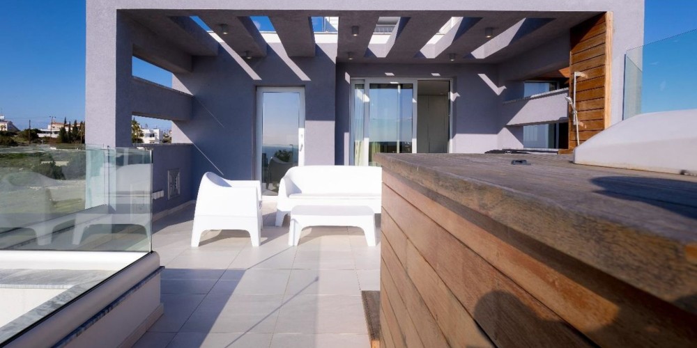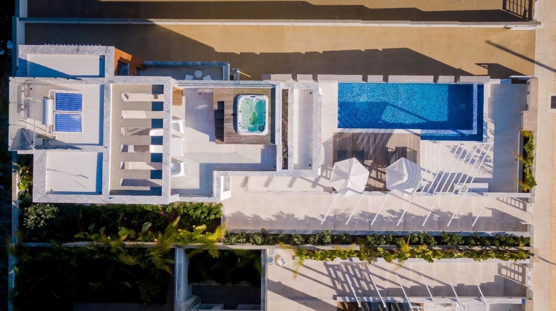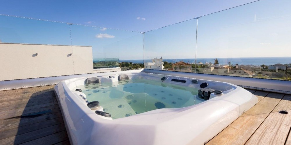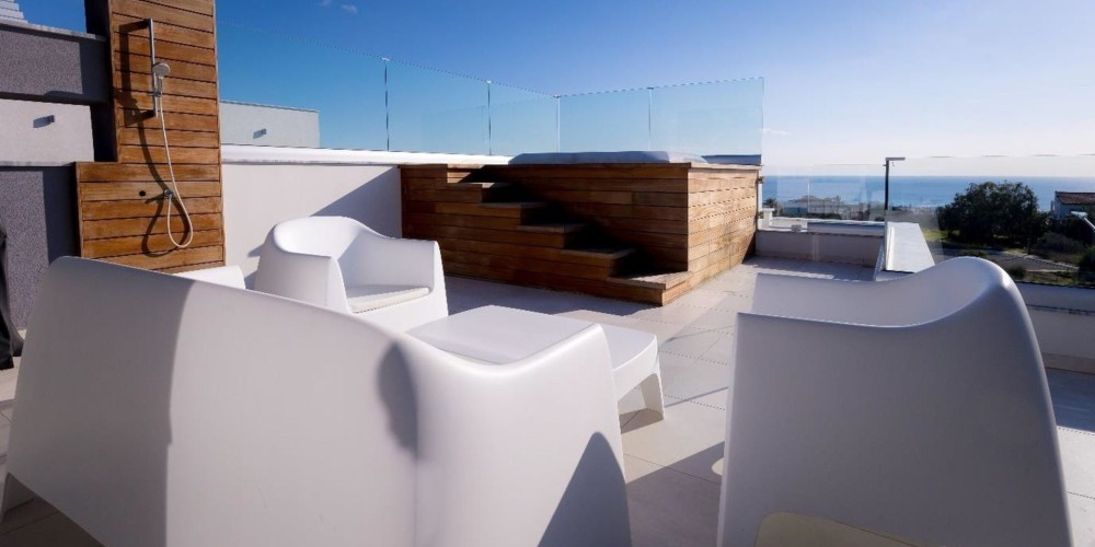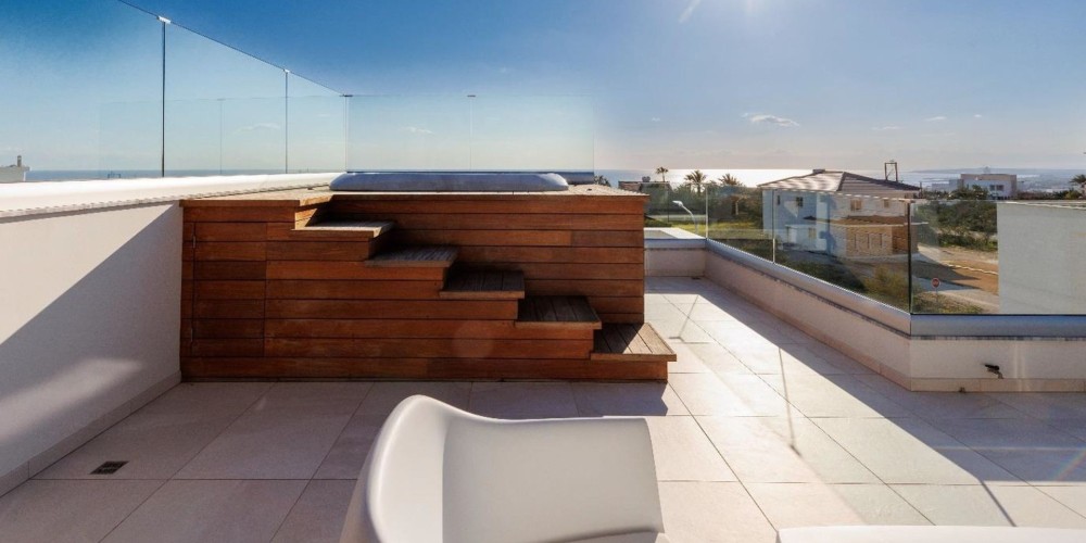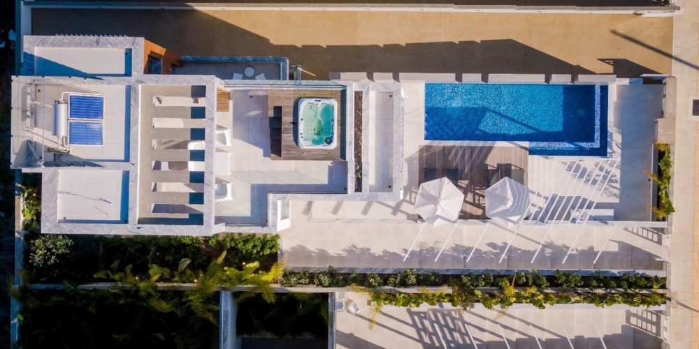 The villa’s exterior features practical and visually pleasing finishing materials. Inside, surfaces, fixtures and fittings have all been meticulously chosen to be both beautiful and long-lasting. The living room, kitchen and patio with the pool are all located on the ground floor. Two of the ensuite bedrooms are placed on the first floor and a third ensuite bedroom is found on the second floor, next to the roof terrace with the jacuzzi.