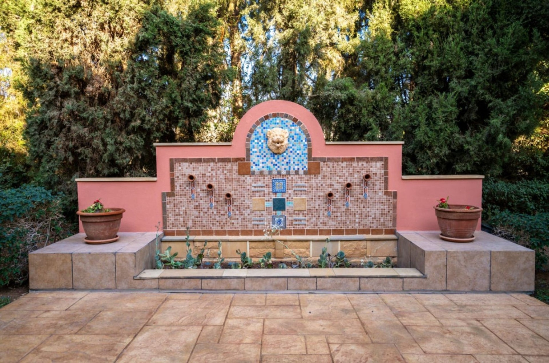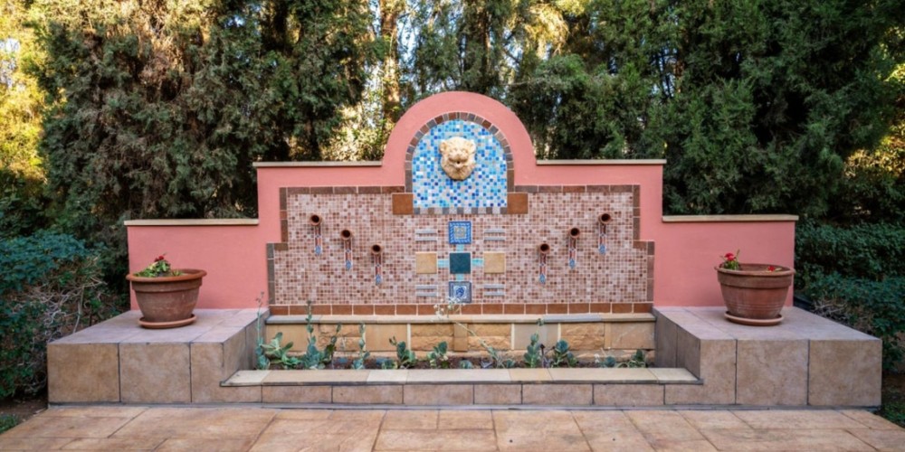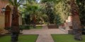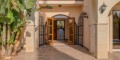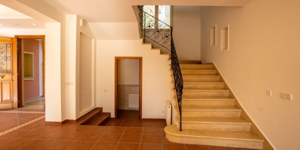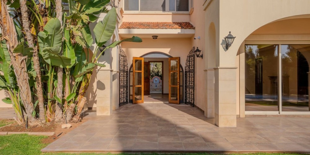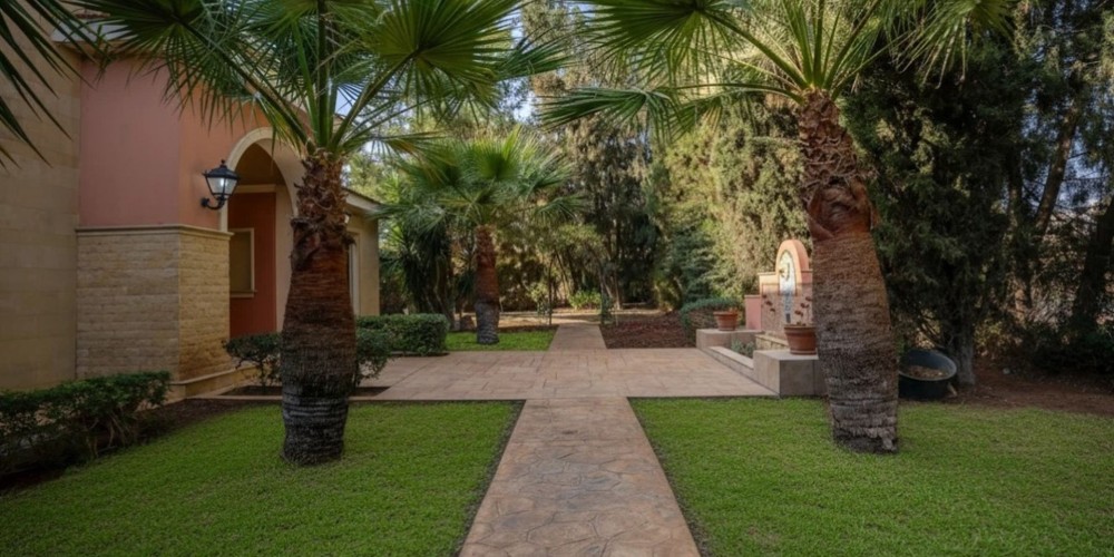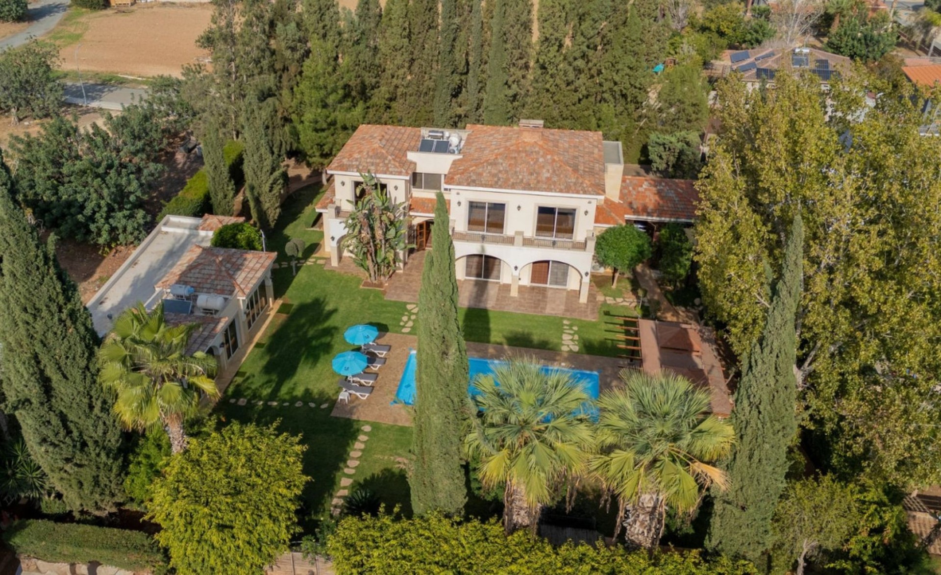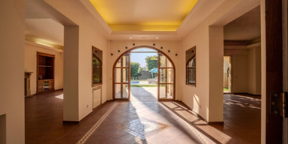 The main residence spans on a spacious plot, has a grand entrance and elegant foyer as well as the living and dining areas with a fireplace. The main area also features kitchen, secondary kitchenette, pantry, wine cellar and a utility room, with an access to a covered three-car garage.