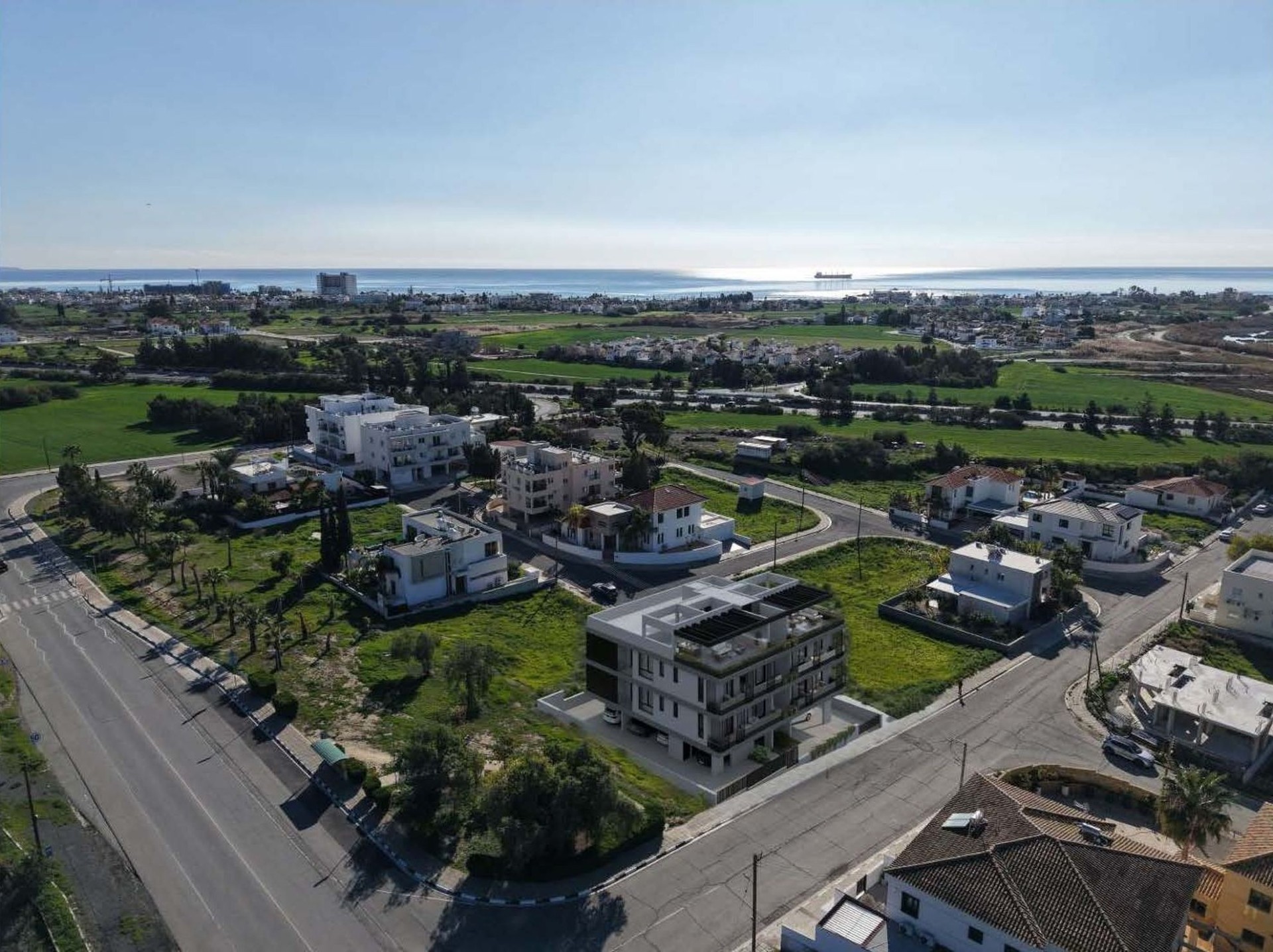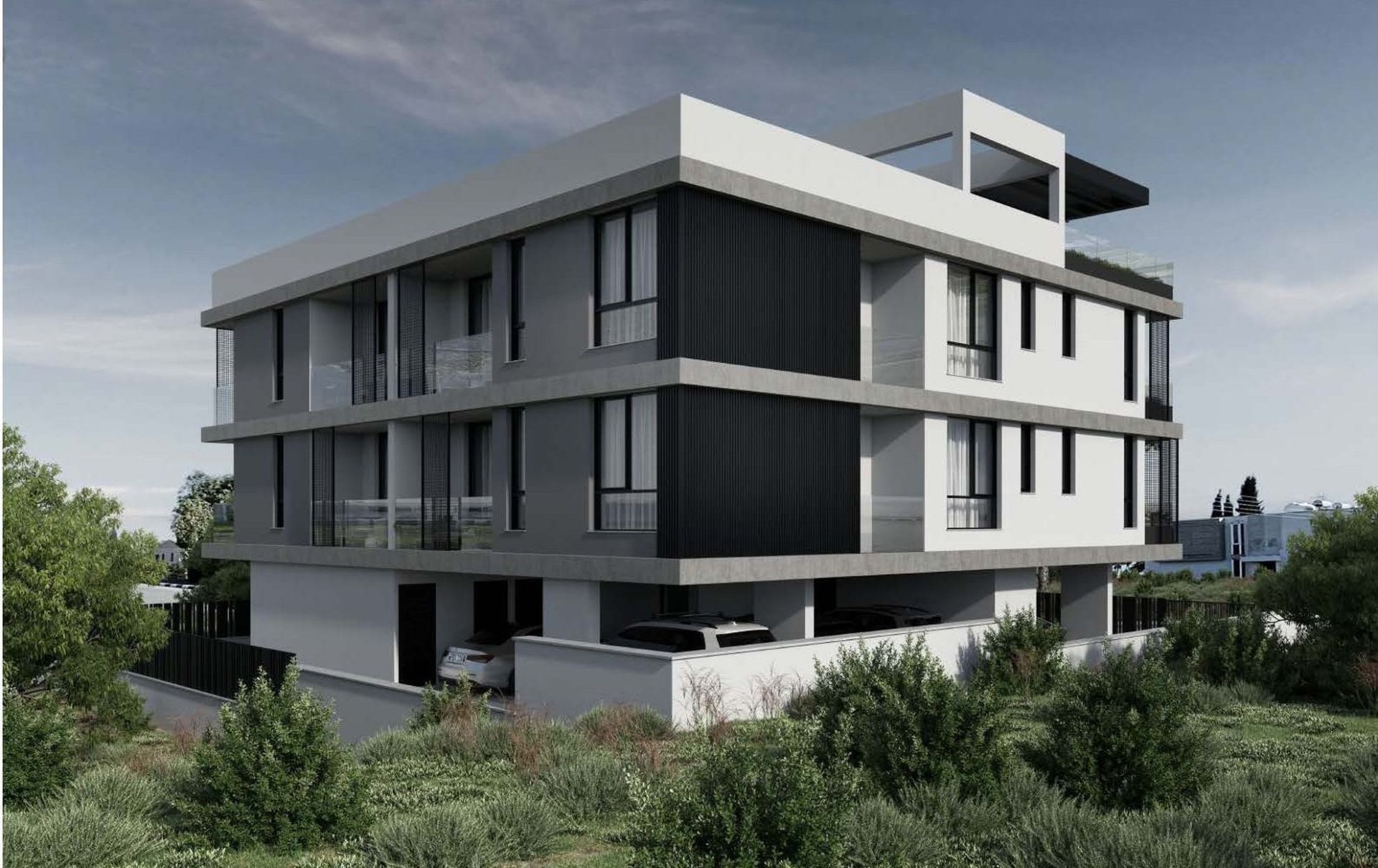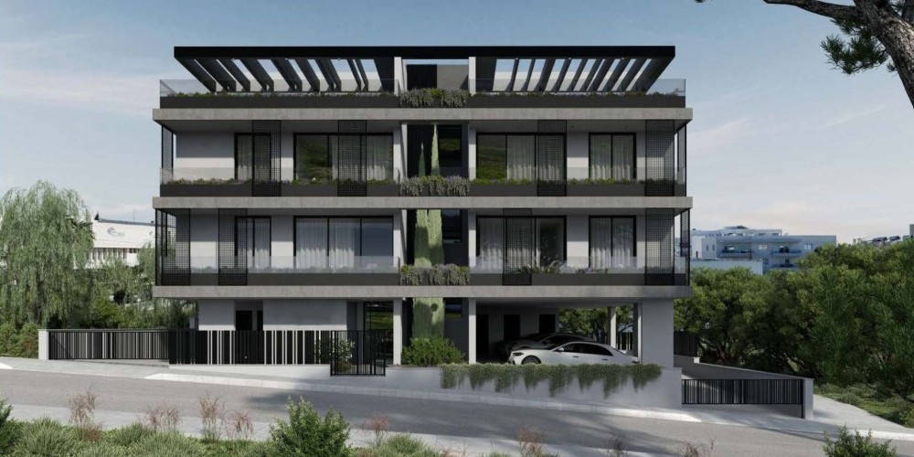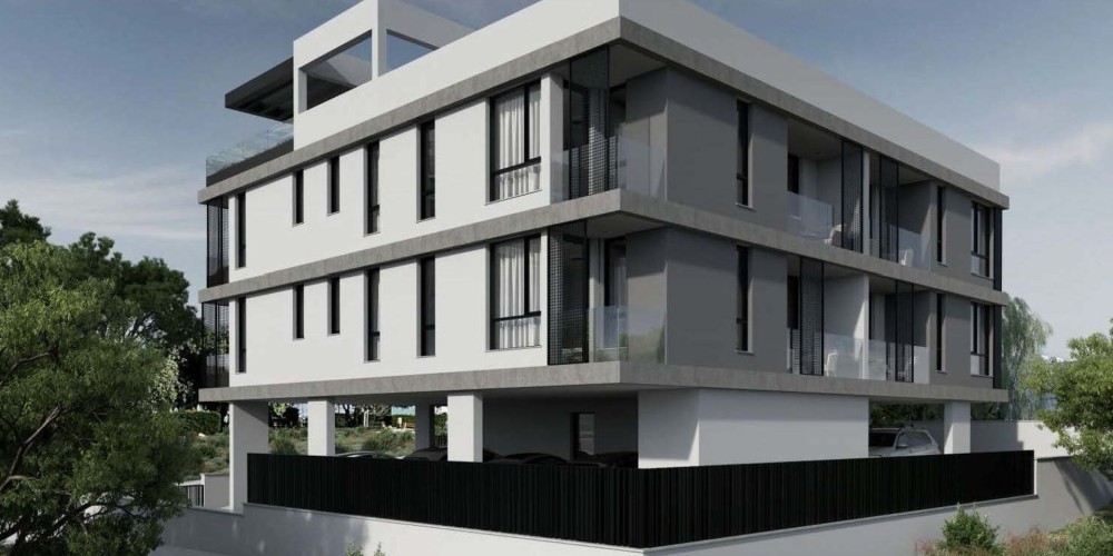 Modern residential building located in Oroklini, comprising two residential floors with a shared roof top with a garden.