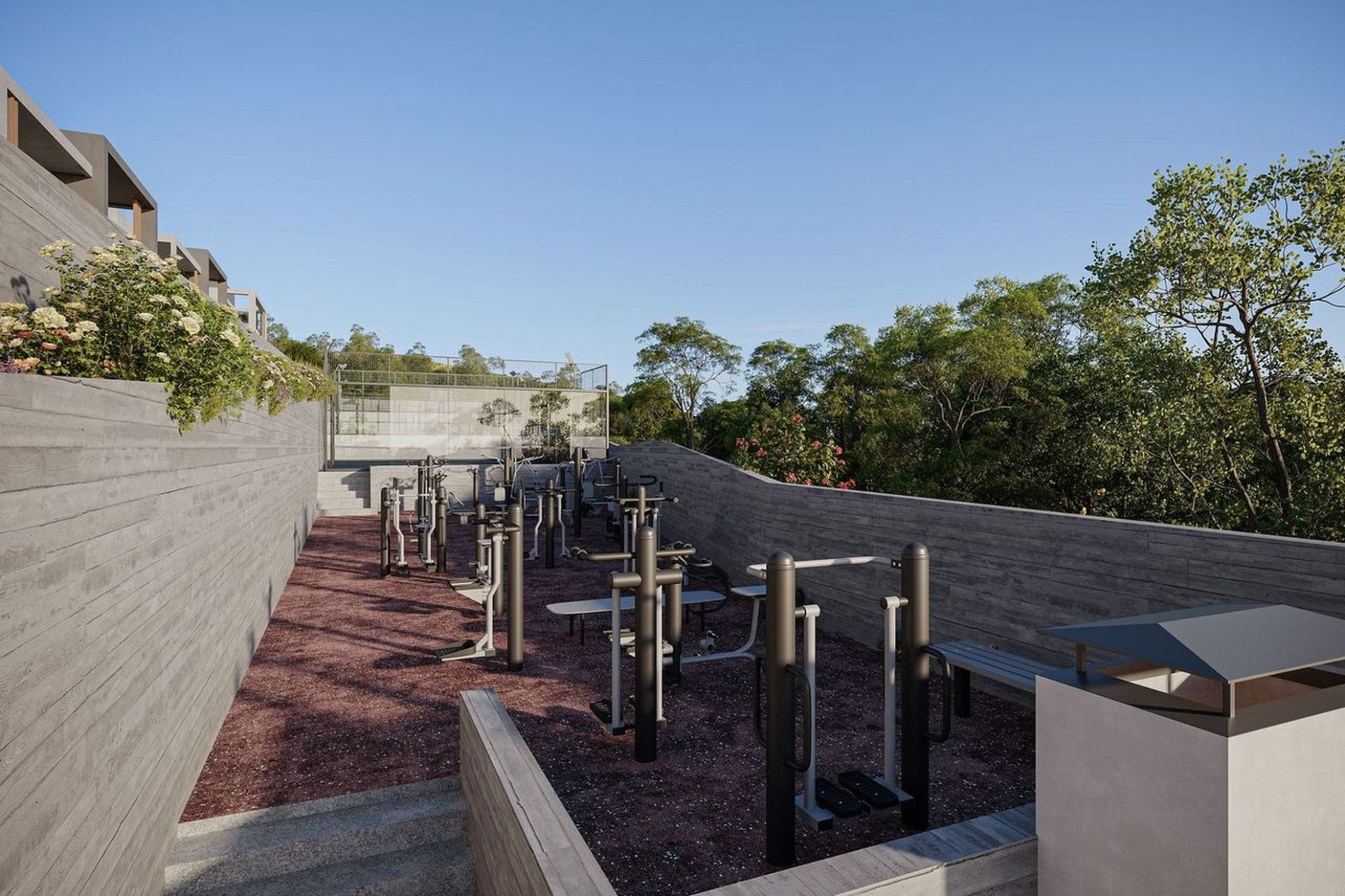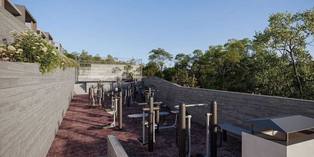 The project follows a resort-style residential concept, offering an extensive range of shared facilities. These include: concierge, indoor and outdoor gyms, BBQ and recreational areas, children's playground, padel and basketball courts, storage rooms and landscaped communal spaces.