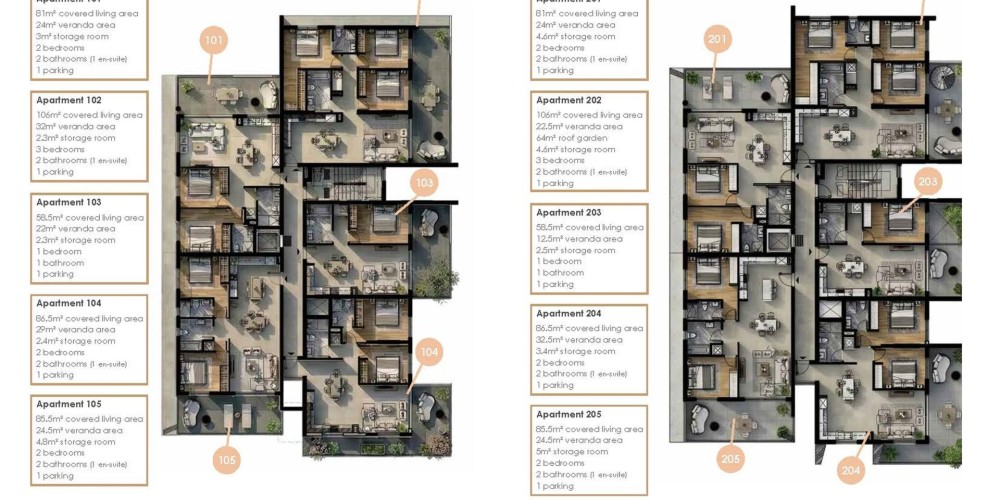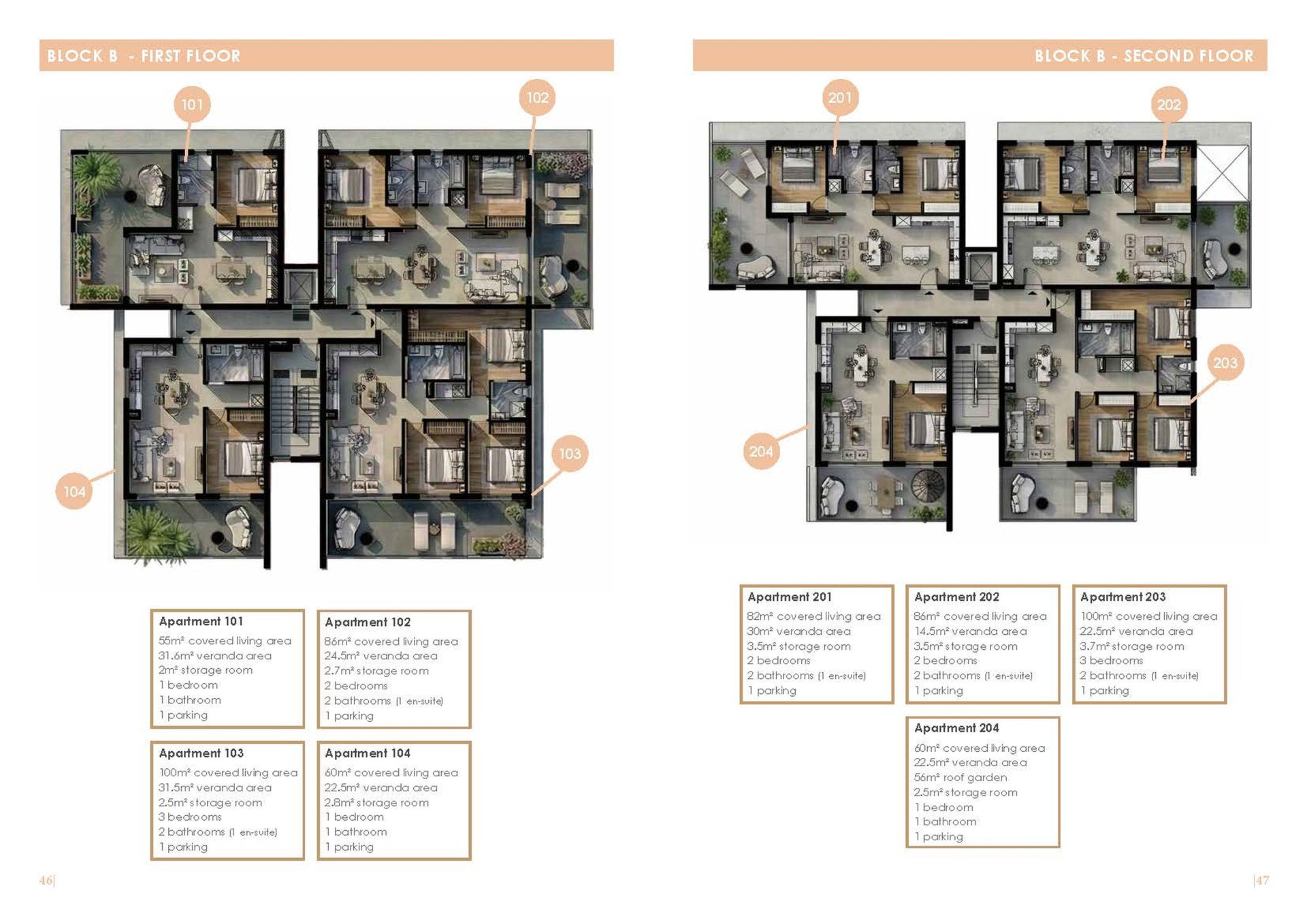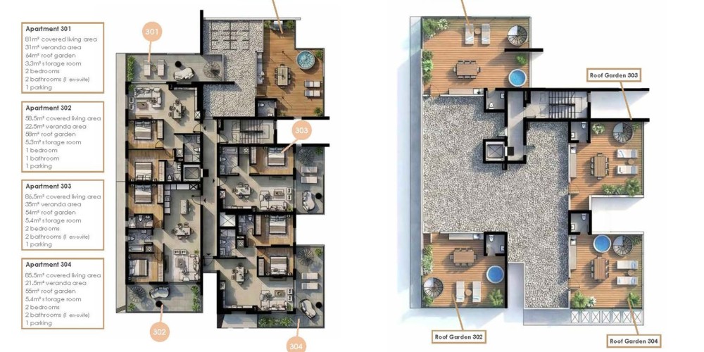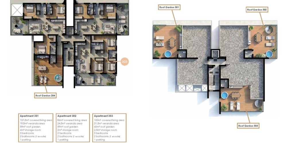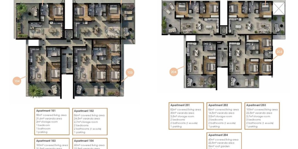 Each apartment will be provided with a parking space and a storage room.