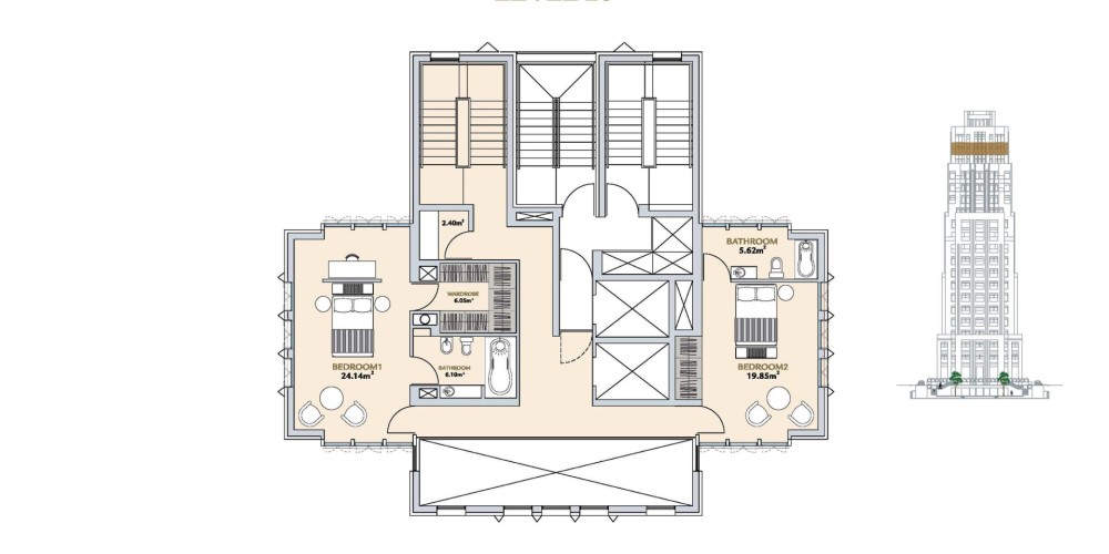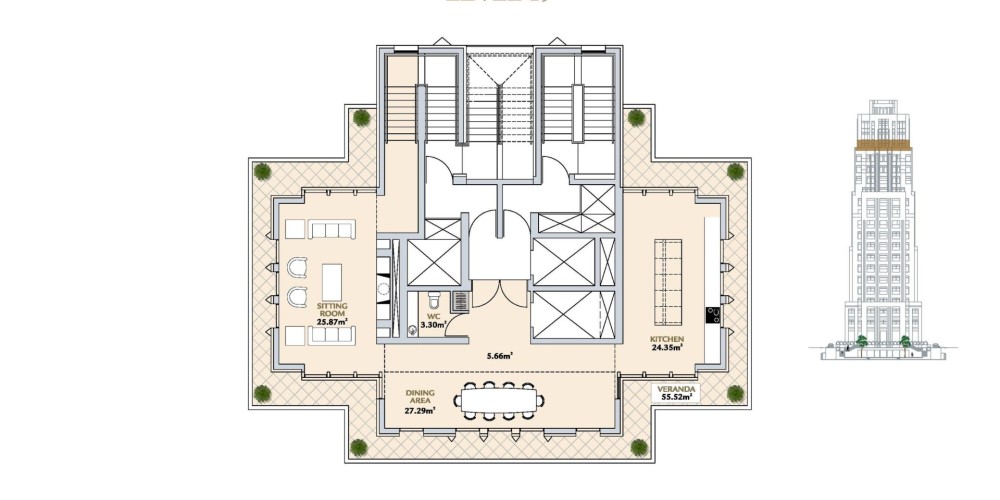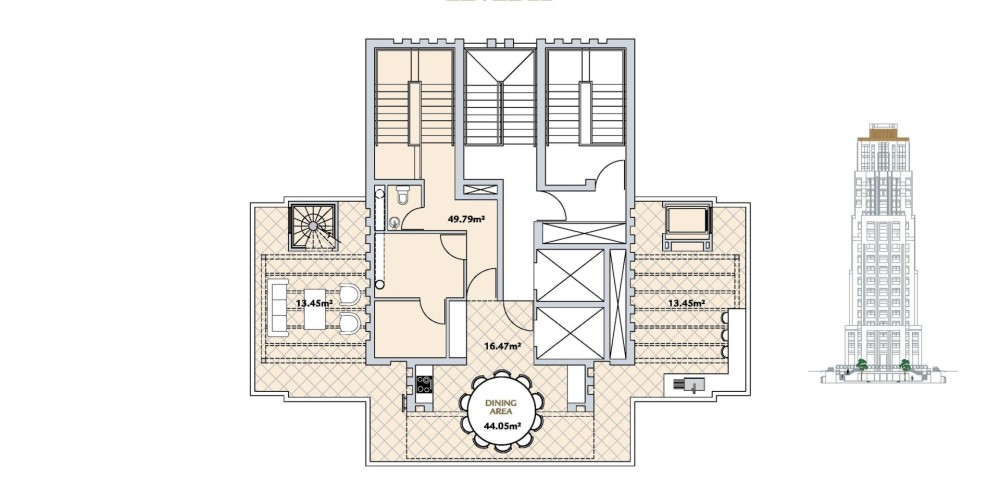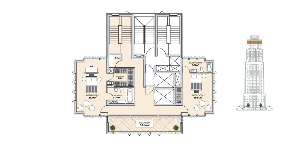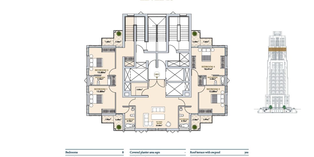 На 13 и 14 уровнях – два этажа SPA, в том числе, внутренний бассейн с подогревом на 14-м уровне в стиле римских бань с хаммамом и VIP лаунжем на двоих, с баром и зоной отдыха.