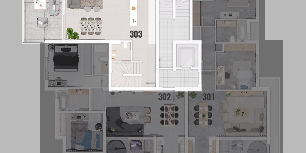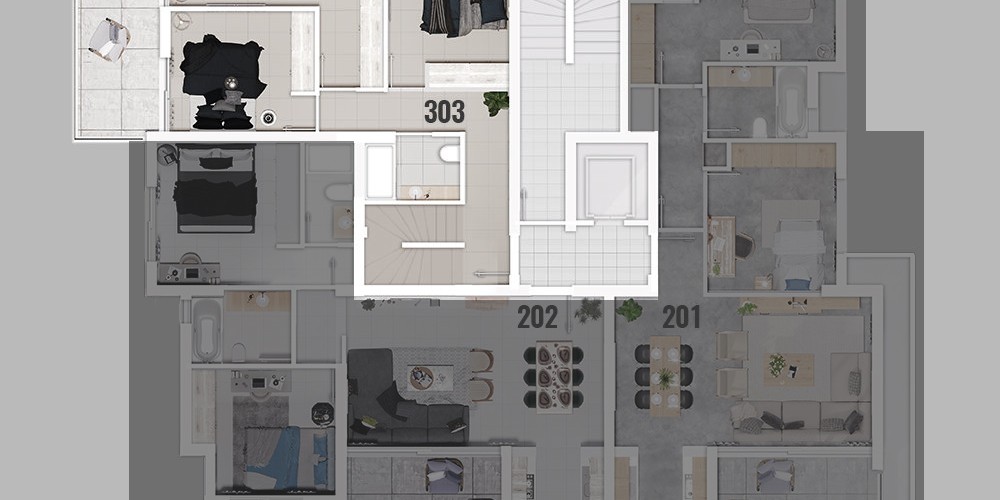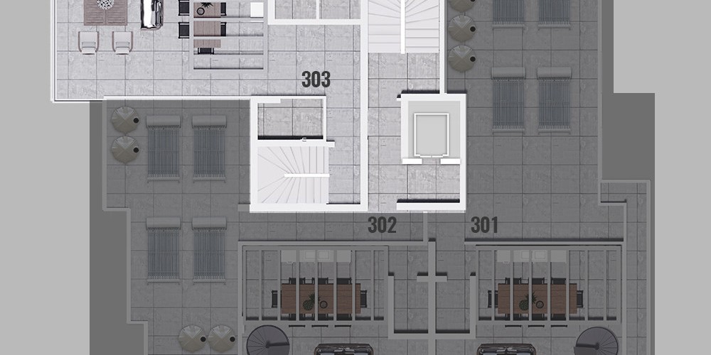 Всего в проекте 8 квартир: 1 квартира с одной спальней на 1 этаже, 4 квартиры с двумя спальнями на 1 и 2 этажах, 2 пентхауса с двумя спальнями на 3 этаже с частным садом на крыше и 1 двухуровневый пентхаус с тремя спальнями с частным садом на крыше на 3 этаже.