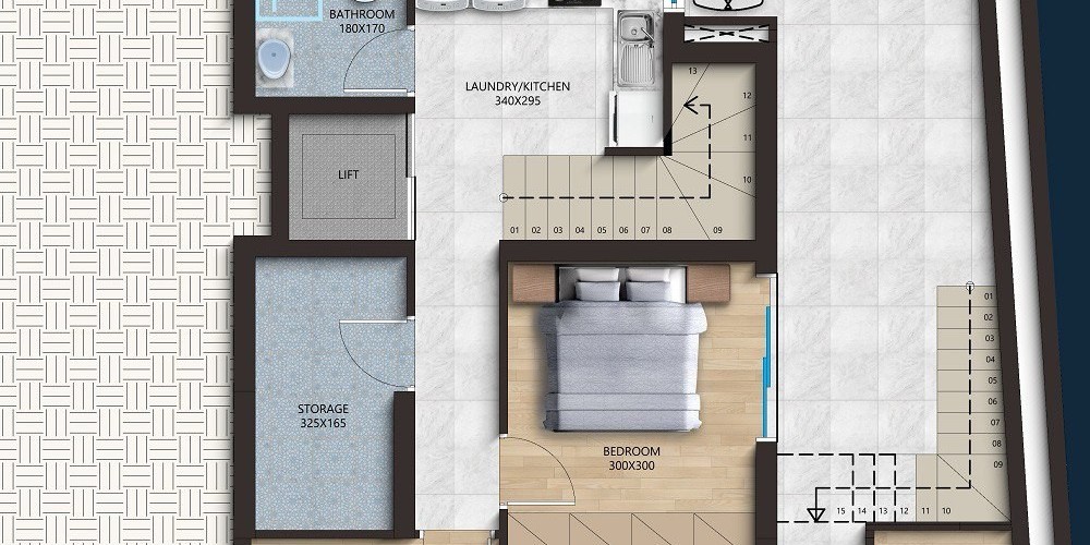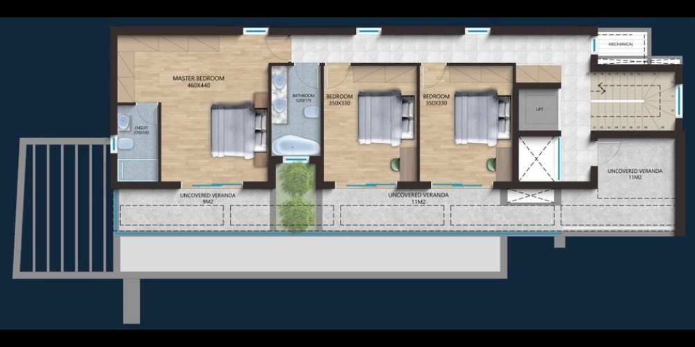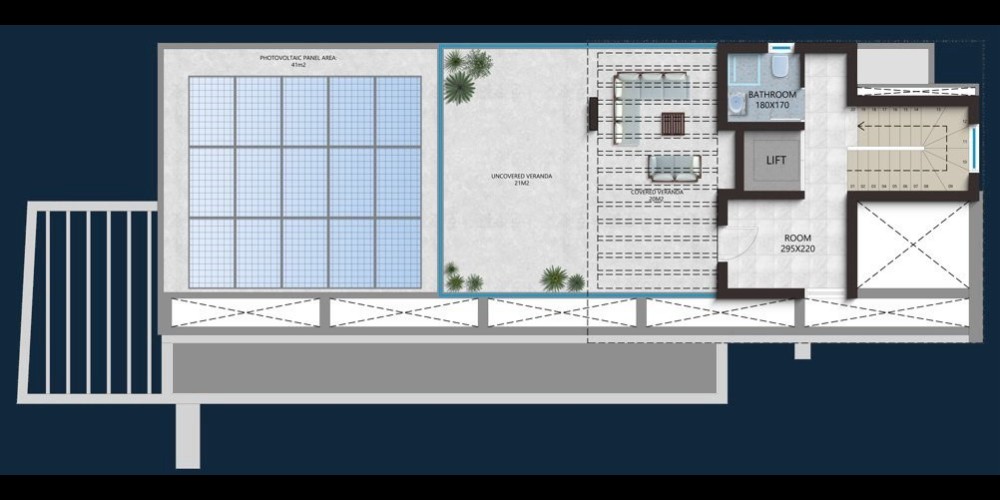 Здание распределено на 4 уровня, среди которых особого внимания заслуживают: терраса-сад на крыше, ухоженные ландшафтные сады, частные охраняемые входы, бассейн с зоной для барбекю, просторные террасы и балконы. Также предусмотрены отдельная комната для персонала, тренажёрный зал и кладовые помещения.