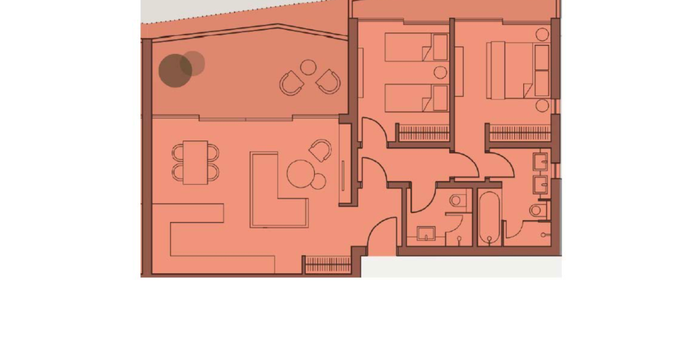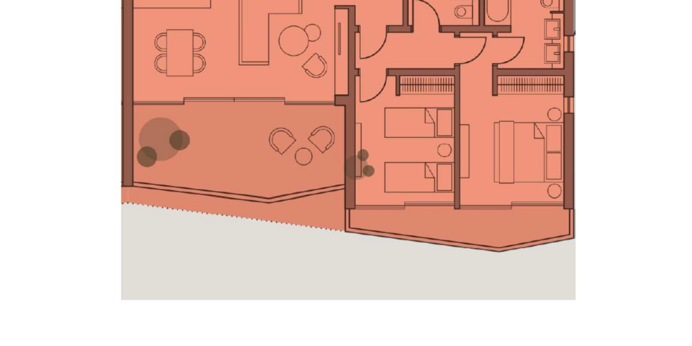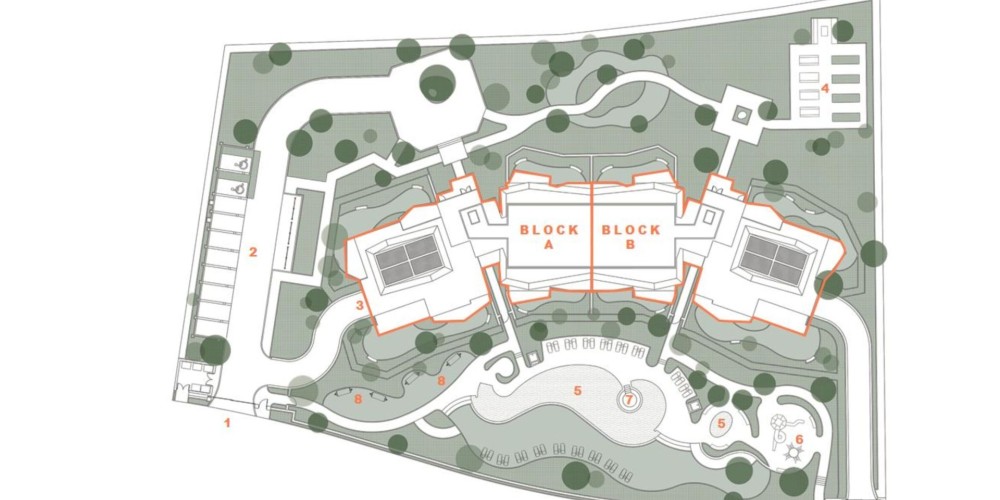 - Два блока с 26 апартаментами: планировки с двумя и тремя спальнями, а также пентхаусы.