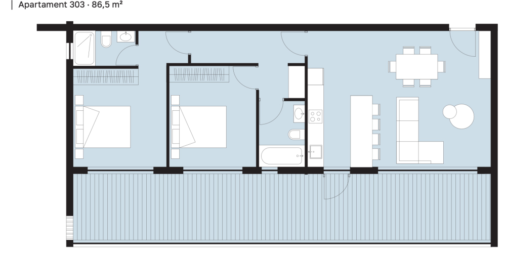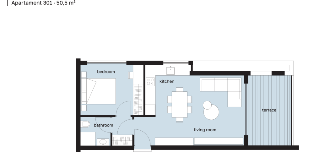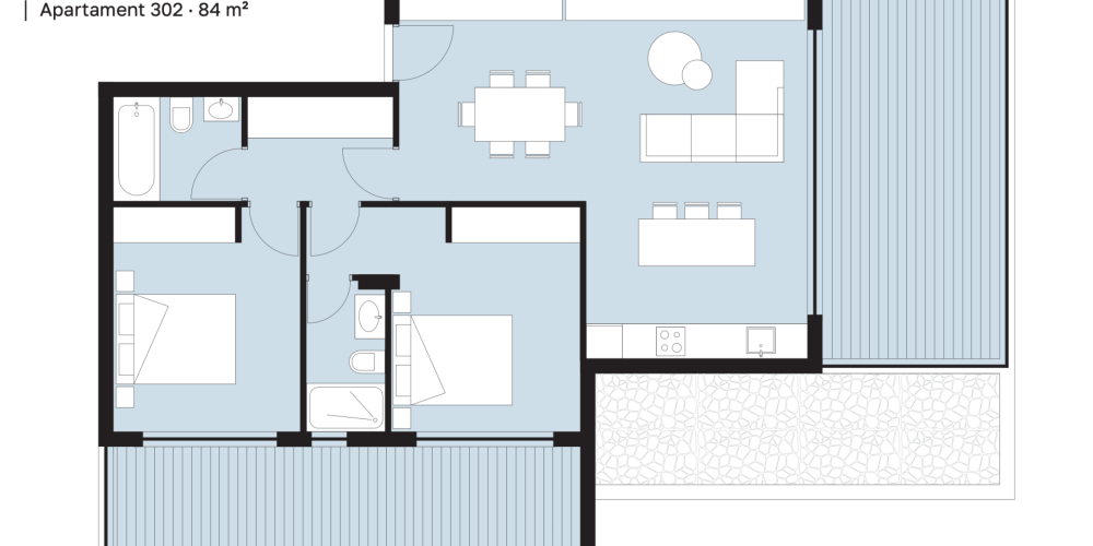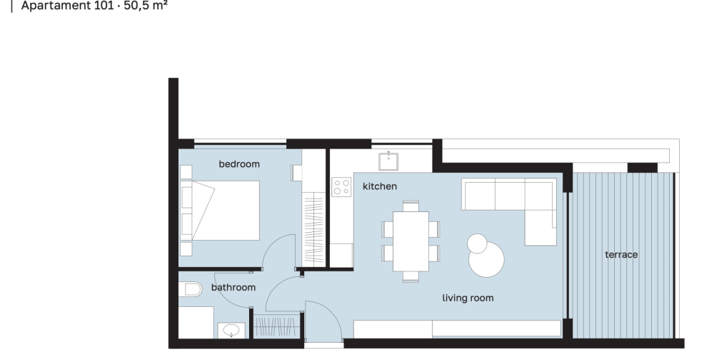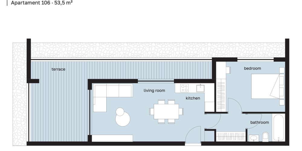 Комплекс состоит из 20 квартир: 14 однокомнатных и 6 двухкомнатных. Первый и второй этажи идентичны, а на третьем и четвёртом этажах предусмотрены отличающиеся по размеру веранды.