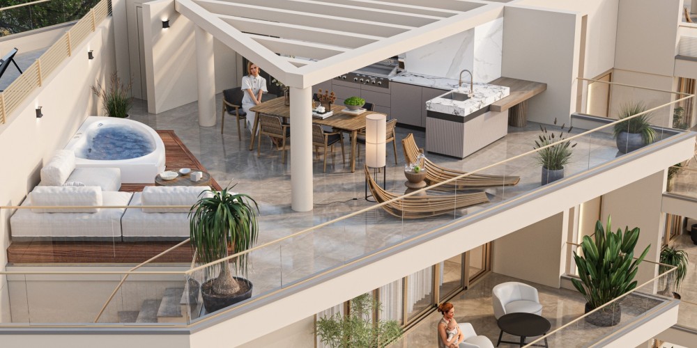 - Пентхаусы с частными террасами на крыше и видом на горы.