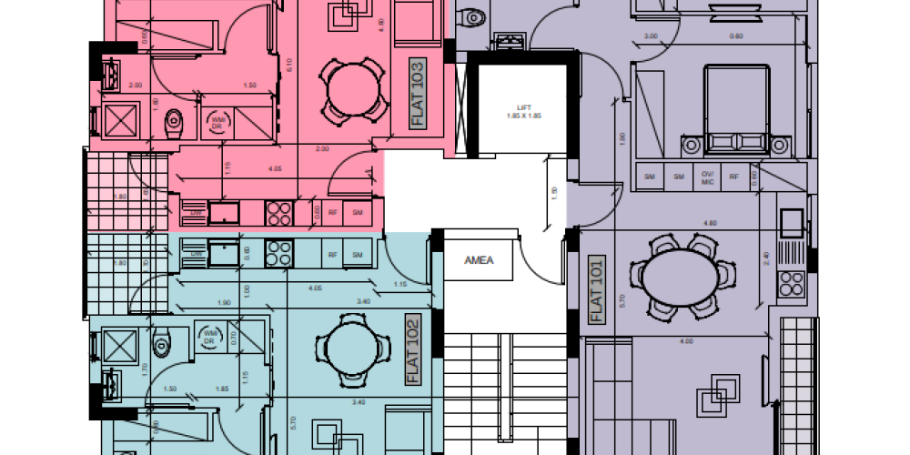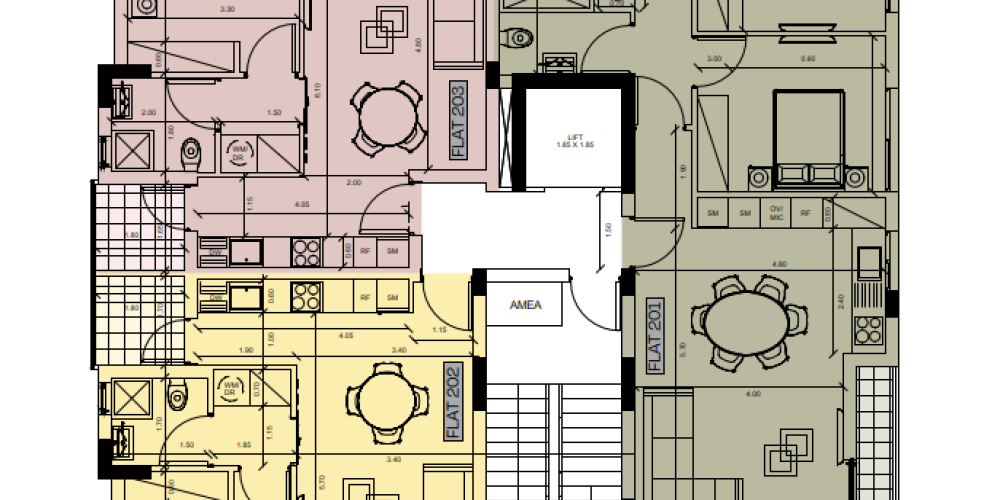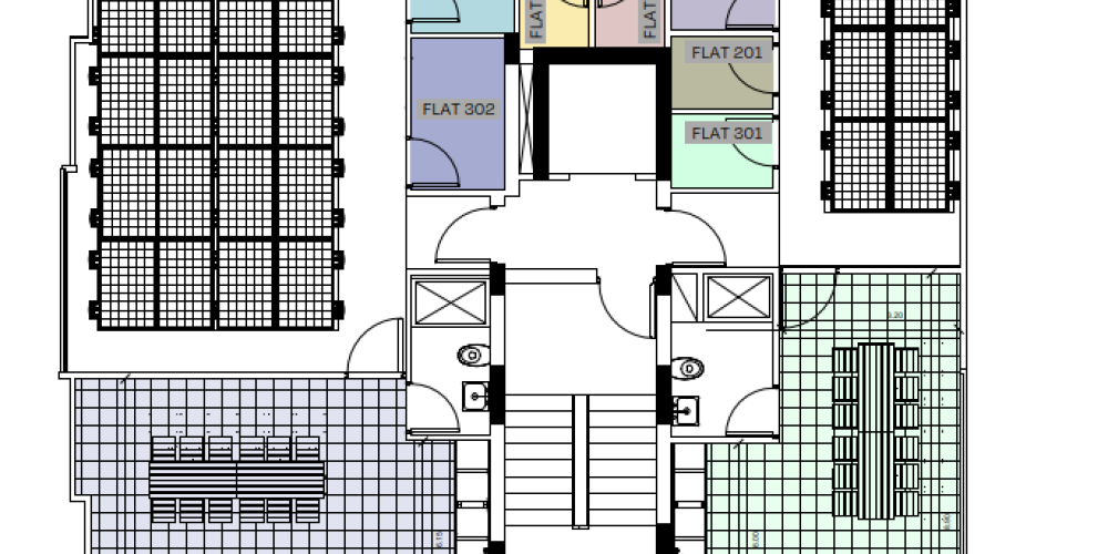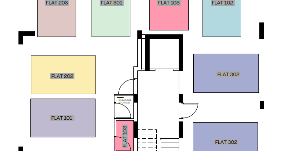 Проект состоит из двух блоков, включающих в себя 17 квартир. В блоке A расположены восемь квартир: две однокомнатные и одна двухкомнатная квартира на каждом из первых двух этажей. На третьем этаже находятся одна двухкомнатная и одна трехкомнатная квартира, обе с садом на крыше. В блоке B предусмотрено девять квартир: две однокомнатные и одна двухкомнатная квартира на каждом этаже, причем квартиры на третьем этаже также имеют сады на крыше.