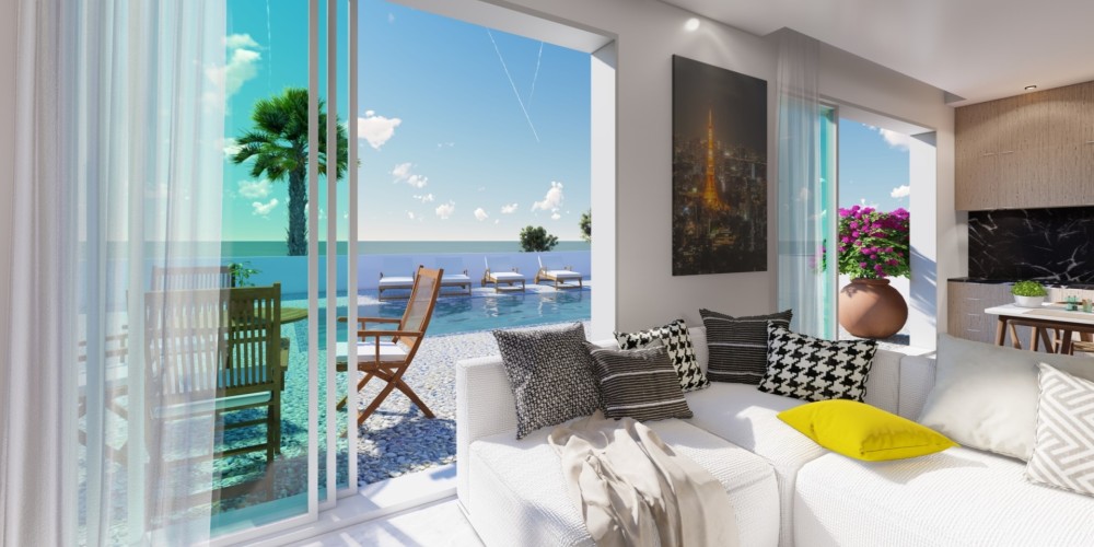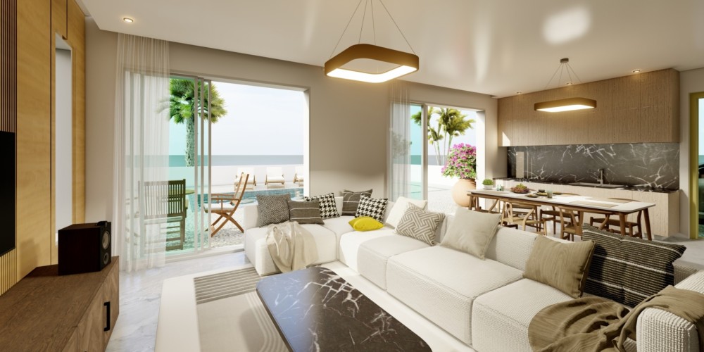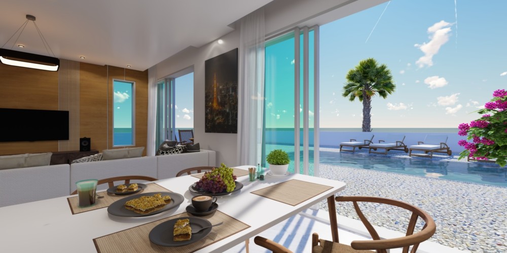 На первом этаже каждой виллы предусмотрена открытая планировка с объединённой кухней, столовой и гостиной, из окон которых открывается вид на частный переливной бассейн. Панорамные двери от пола до потолка с тепло- и звукоизоляцией создают плавный переход между внутренним пространством и уличной зоной. В некоторых виллах также предусмотрены спальня и гостевой санузел на первом этаже.