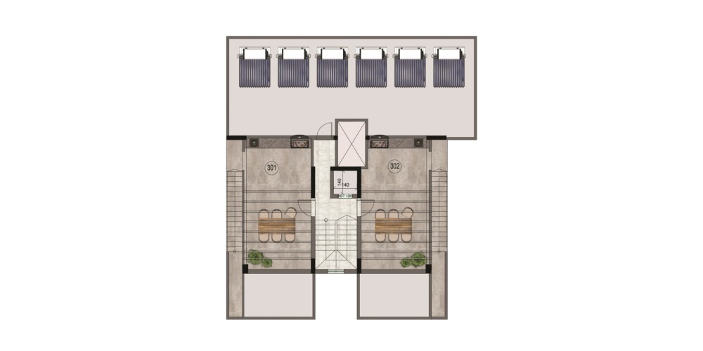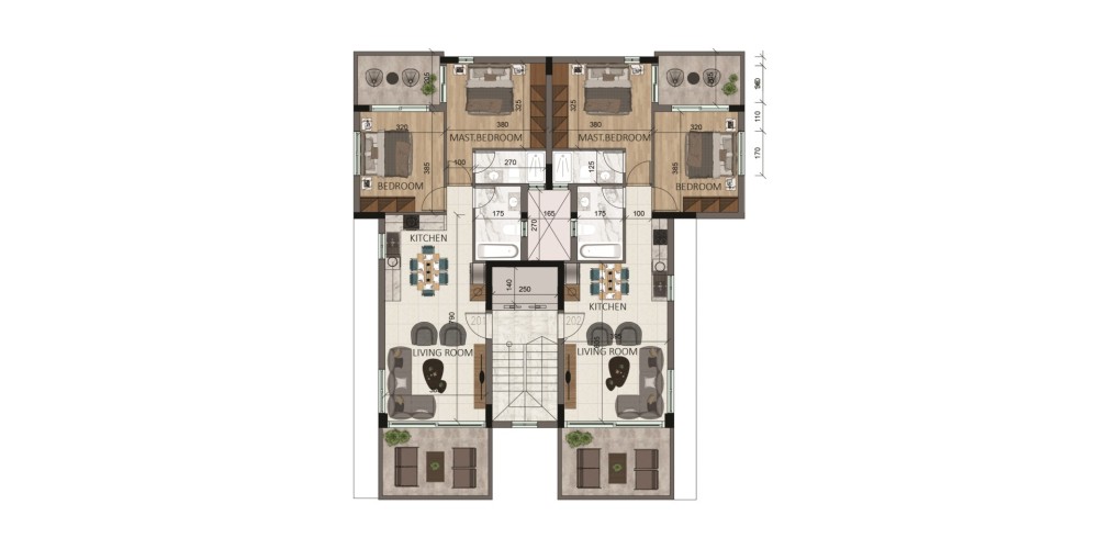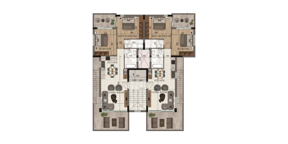 Каждая квартира спроектирована с открытой планировкой кухни и гостиной зоны, хозяйской спальней с отдельной ванной комнатой и качественной внутренней отделкой. Предусмотрены разводка под систему центрального отопления и кондиционирования воздуха, что делает квартиры пригодными для комфортного проживания в течение всего года. В здании также установлен лифт, а его инфраструктура отвечает современным стандартам энергоэффективности (сертификат класса A).