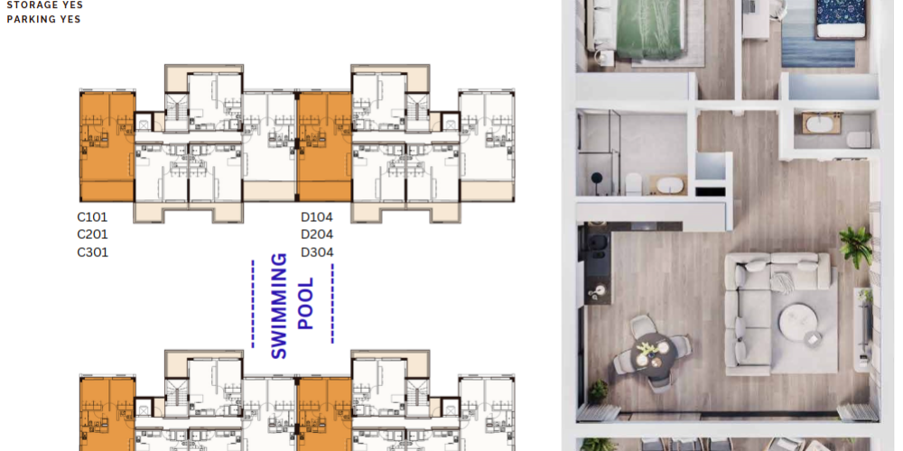 В составе комплекса — 40 однокомнатных, 24 двухкомнатных, 4 трёхкомнатных и 4 четырёхкомнатных квартиры. В каждой квартире предусмотрены открытая планировка гостиной и кухни, просторные спальни, современные ванные комнаты, приватные балконы и встроенные системы хранения. Благодаря большим раздвижным окнам жилые помещения наполняются естественным светом.