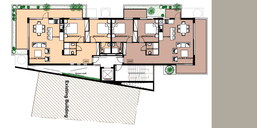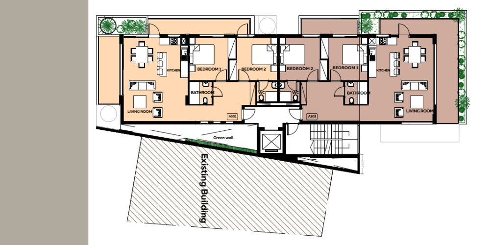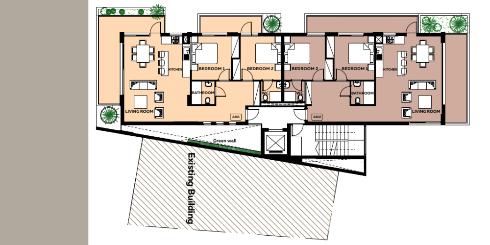 Жилой комплекс представляет собой трехэтажное здание, состоящее из шести апартаментов с двумя спальнями. На каждом этаже расположено по две квартиры, что обеспечивает низкую плотность застройки и спокойную атмосферу для проживания.