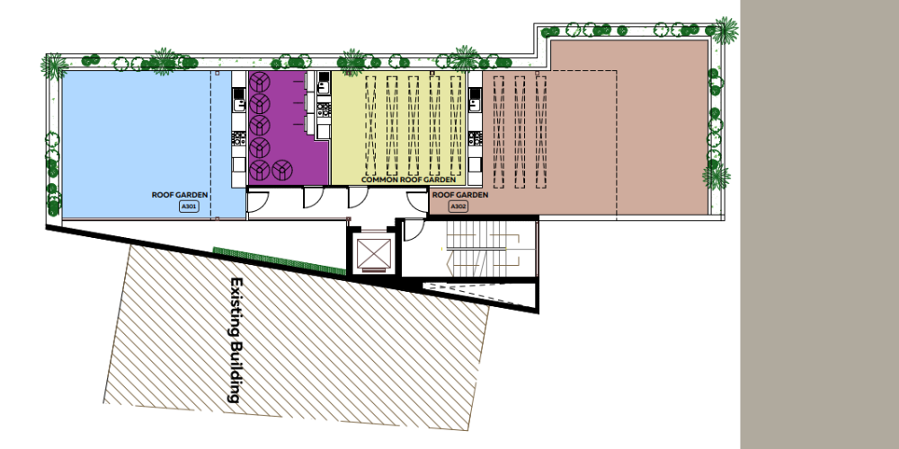 Два пентхауса на третьем этаже имеют просторные частные террасы на крыше с видом на море. По желанию владельцев террасы могут быть дополнены частным бассейном или джакузи. Также для всех жителей доступна общая терраса на крыше.
