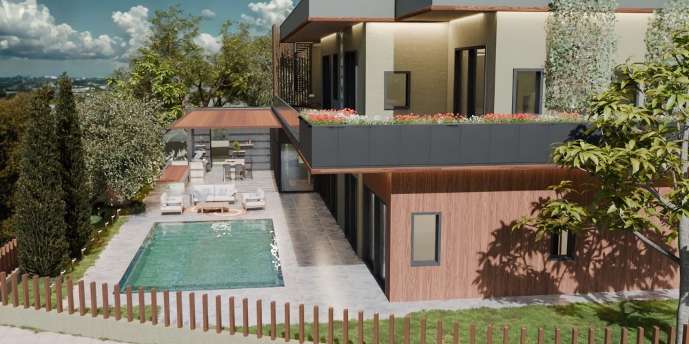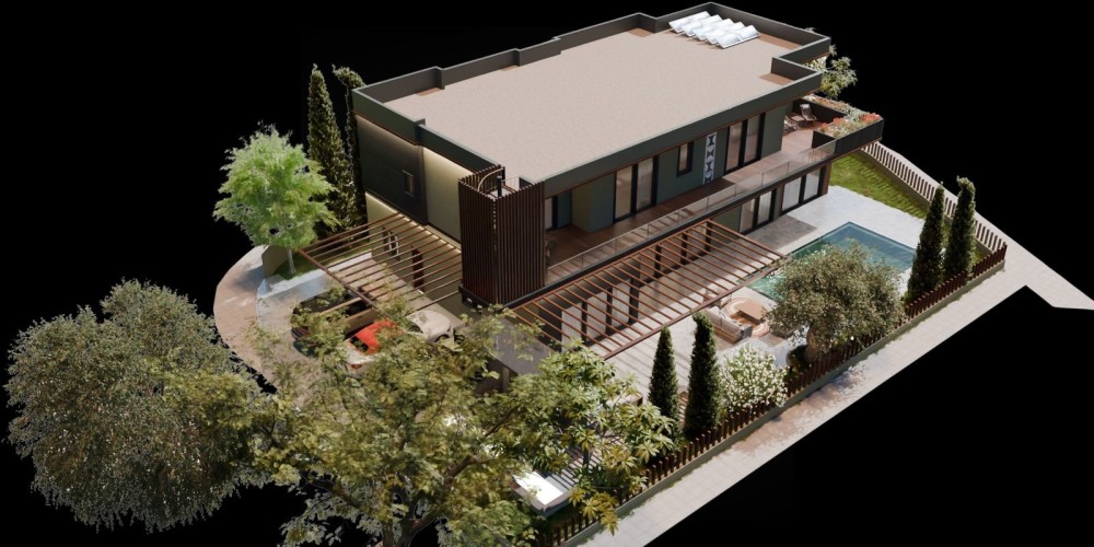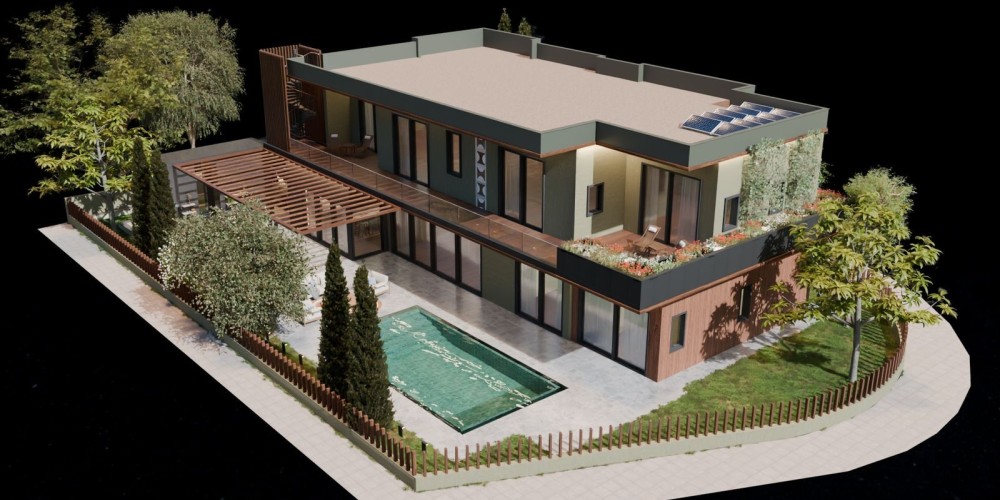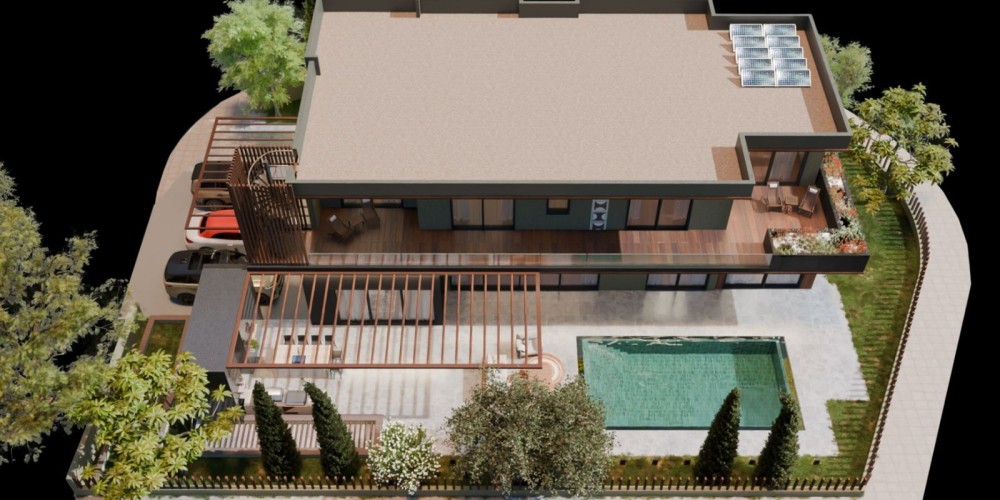 Вилла занимает угловой участок, который граничит с пешеходной дорожкой, общественной зелёной зоной и тупиковой улицей — это гарантирует минимальный уровень движения и ощущение уединения. При этом объект находится в шаговой доступности от всей необходимой инфраструктуры: пляжа, супермаркетов, школ и других удобств.