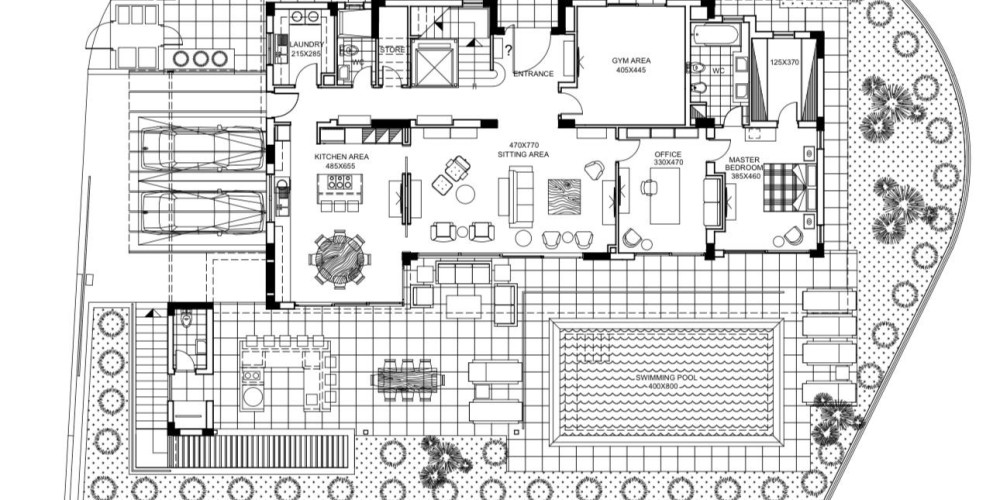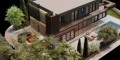 Проект включает три уровня, соединённых лифтом. Пространства спроектированы с учётом естественного освещения, функциональности и свободного перемещения между внутренней и внешней зонами. На первом этаже располагается мастер-спальня с прямым выходом в сад и к бассейну, кухня открытого типа, гостиная, кабинет, тренажёрный зал, кладовая и отдельная хозяйственная кухня.