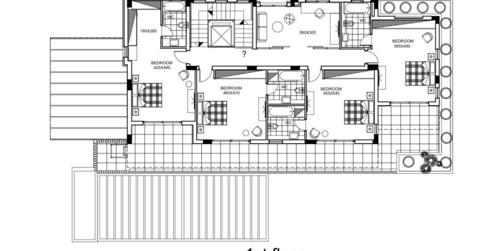 - Четыре спальни с ванными комнатами на втором этаже и общей жилой зоной