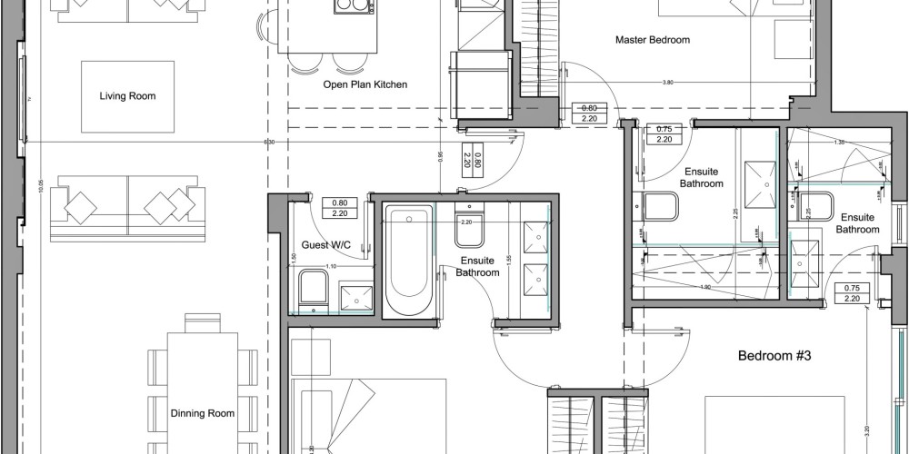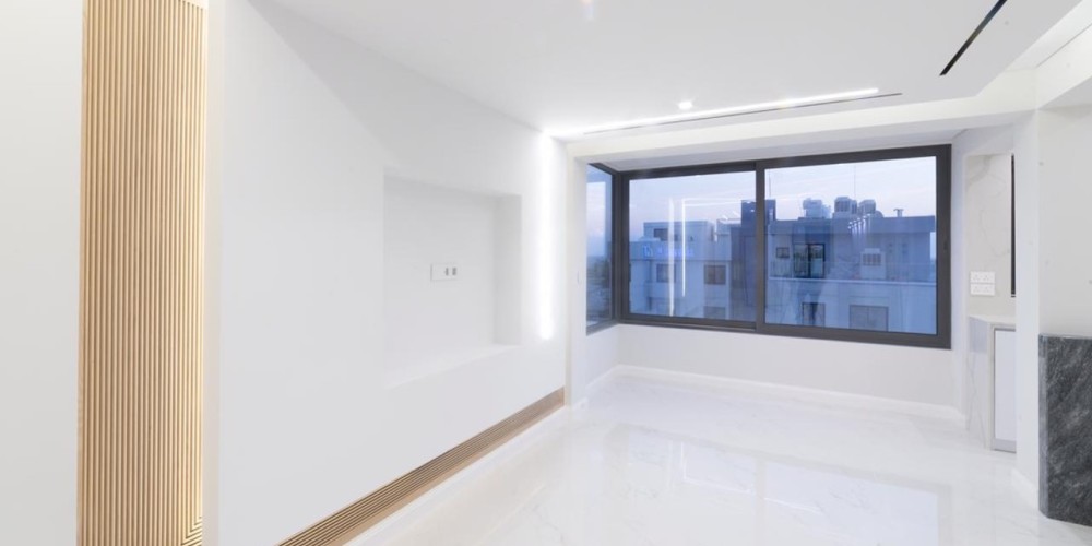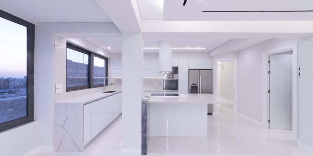 Общая крытая площадь составляет 118 м². Планировка включает гостевой санузел, главную спальню с отдельной ванной комнатой, а также две дополнительные спальни с собственными ванными. Просторная кухня объединена с гостиной в едином открытом пространстве. В отделке использованы натуральные материалы — мрамор, гранит и натуральное дерево.