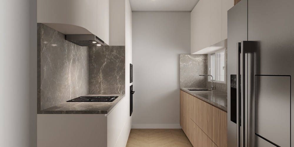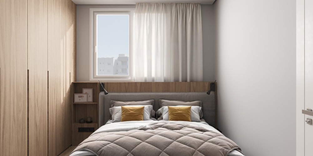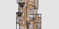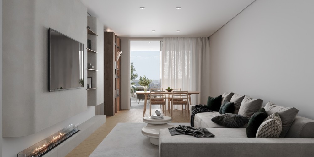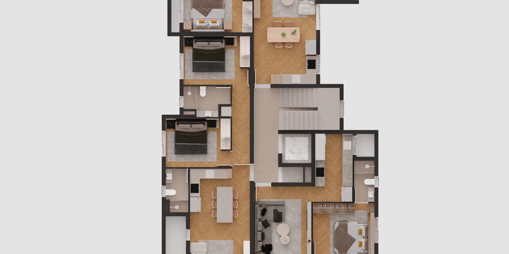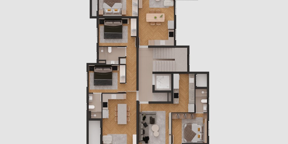 На первом этаже расположены три квартиры с двумя спальнями и двумя ванными комнатами. На втором и третьем этажах также размещены по три аналогичные квартиры, с сохранением единого подхода к планировке и удобствам. Апартаменты третьего этажа имеют эксклюзивный доступ к частным террасам на крыше площадью 50 м². Эти террасы оборудованы дополнительной комнатой, третьей ванной комнатой и предусмотренной зоной для барбекю.