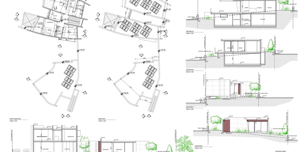 Основной дом занимает несколько уровней и включает три просторные спальни, кабинет и открытую кухню-гостиную-столовую с панорамным остеклением и видом на море. Главная спальня оборудована гардеробной и ванной комнатой. Из холла открывается выход к панорамному инфинити-бассейну с видом на море. На нижнем уровне — домашний кинотеатр/тренажерный зал и отдельные апартаменты с одной спальней и собственным входом, которые можно использовать для гостей или персонала.