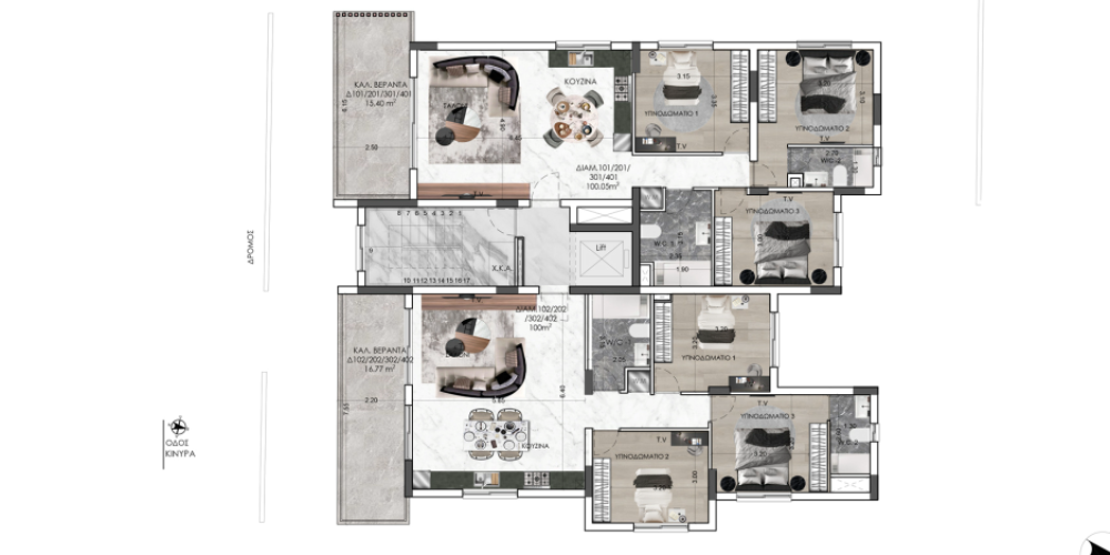 Жилой проект представляет собой четырехэтажное здание, в котором расположено восемь апартаментов с тремя спальнями. В квартирах на 2-м, 3-м и 4-м этажах предусмотрена возможность установки фотоэлектрической системы мощностью 2 кВт, что способствует повышению энергоэффективности и снижению затрат на электроэнергию.