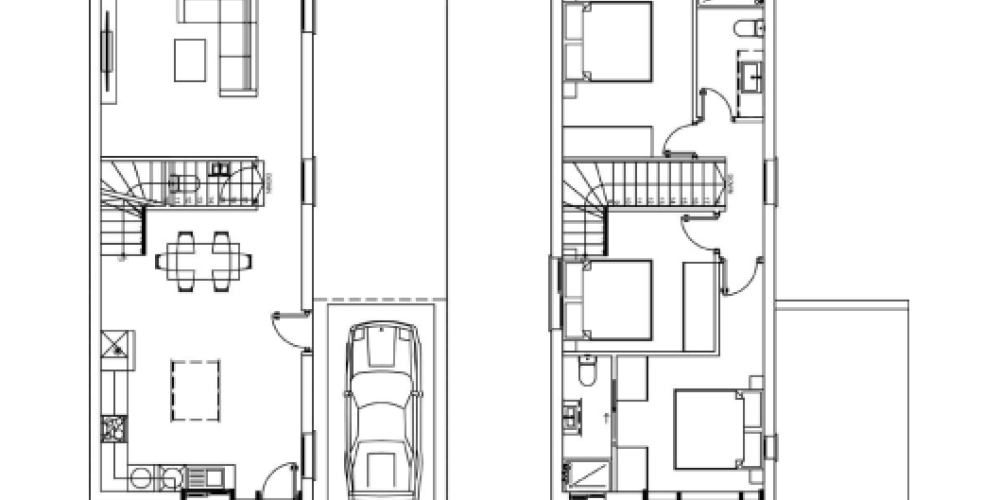 Дома находятся в малоэтажном жилом районе с низкой плотностью застройки, что обеспечивает спокойную атмосферу в окружении природы. Здания выполнены в виде смежного блока, каждый дом включает крытое парковочное место и построено с учетом современных требований к энергоэффективности (сертификат класса A). Планировка организована на двух уровнях с акцентом на комфорт и рациональное использование пространства.