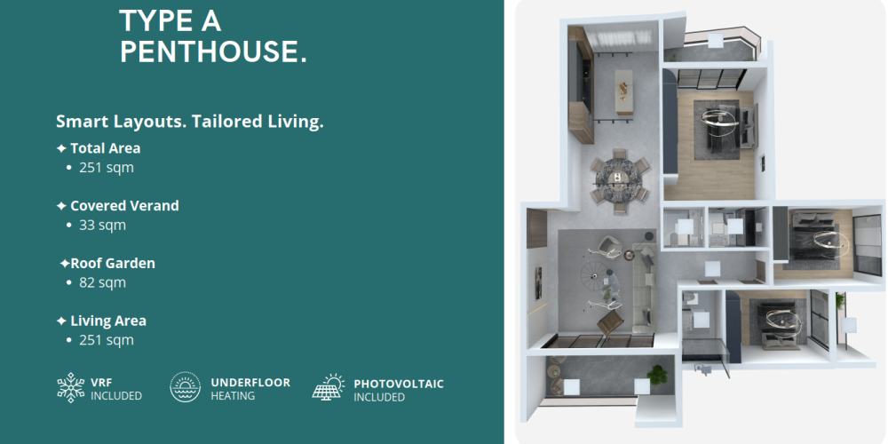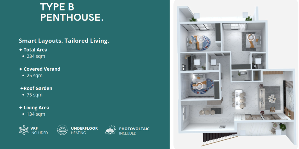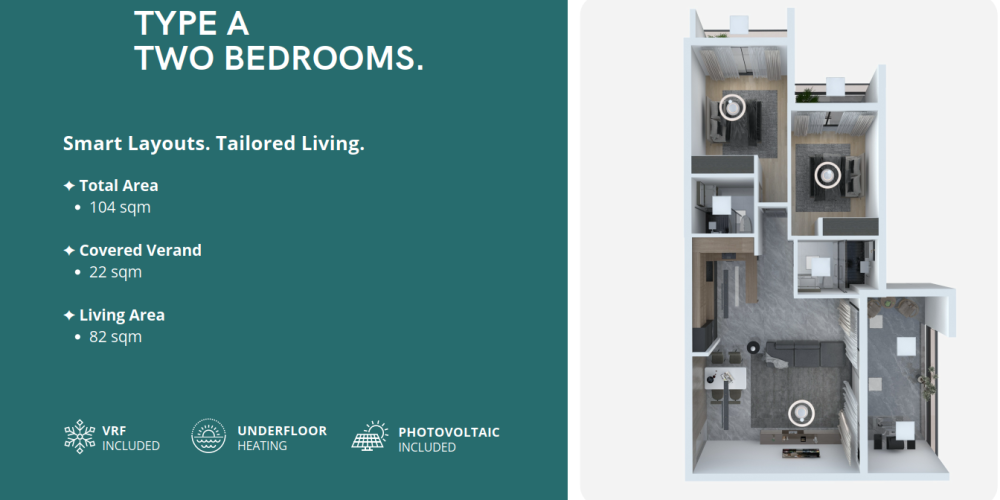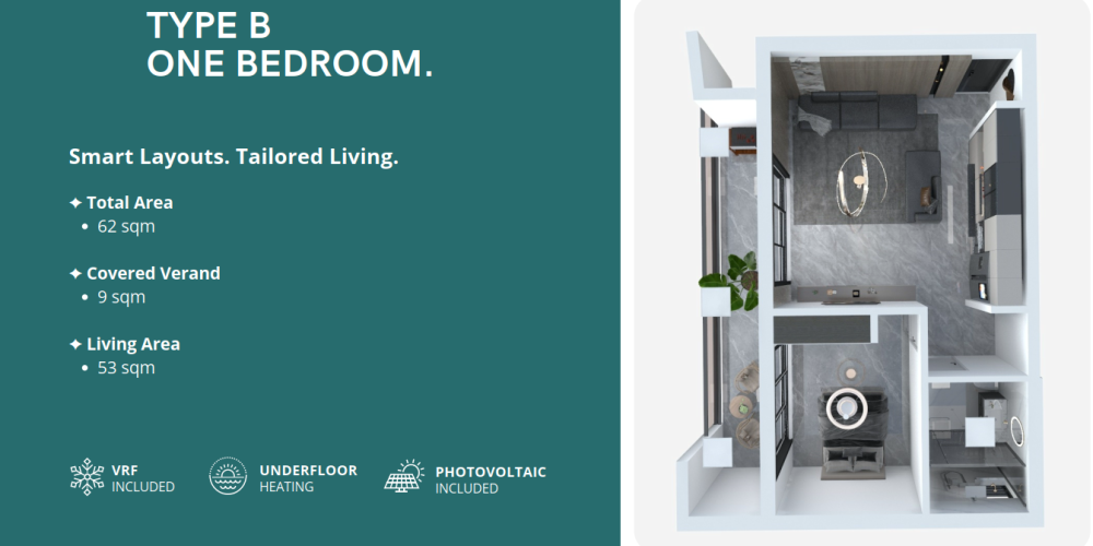 Комплекс спроектирован с учётом энергоэффективности и комфорта: во всех квартирах установлено электрическое напольное отопление и система VRF-климат-контроля. Солнечные панели обеспечивают экономию электроэнергии, а каждое парковочное место подготовлено под установку зарядки для электромобиля.
