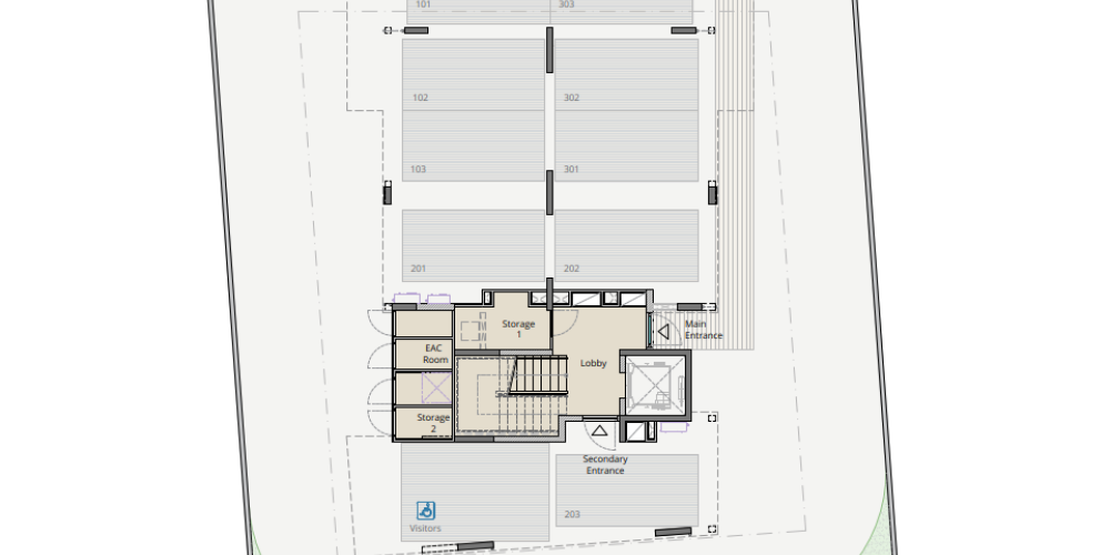 Внешний облик здания отражает современный минималистичный подход. Внутреннее оформление ориентировано на практичность и удобство. Общие зоны включают парадный вход, внутреннюю лестницу и лифт. В комплексе предусмотрены крытые парковочные места, а также подготовка под установку кондиционеров и солнечных панелей.