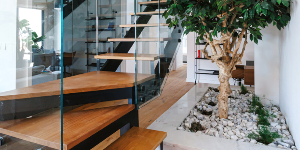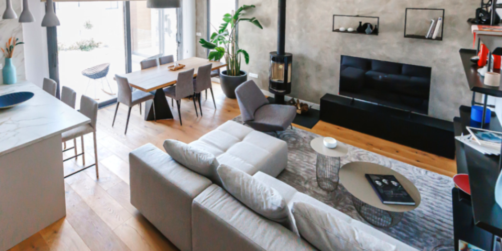 На основном уровне расположена просторная гостиная открытой планировки с современным, полностью функционирующим камином и выходом на большую террасу. Кухня оснащена встроенной мебелью и высококачественной отделкой. Индивидуально спроектированная лестница ведёт к верхнему этажу, где находится спальня с выходом в сад на крыше и зону для барбекю — идеальное место для отдыха на открытом воздухе.