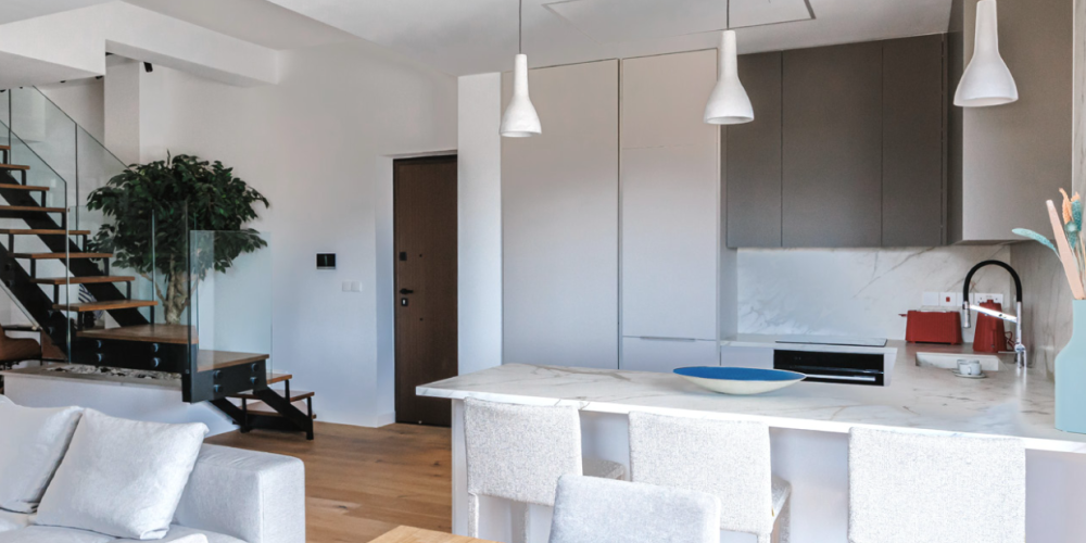 Этот недавно завершённый двухуровневый пентхаус расположен в жилом районе Агиос Афанасиос — одном из самых благоустроенных пригородов Лимассола. Объект сочетает в себе функциональность и продуманный дизайн, предлагая панорамные виды на море и город с частной террасы на крыше.