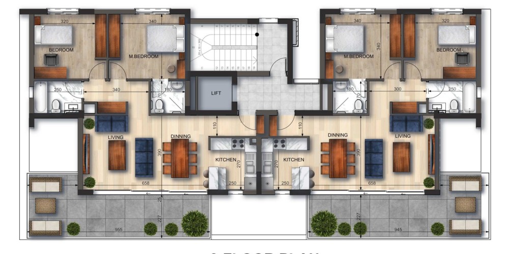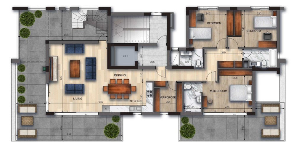 На первом и втором этажах расположены по две квартиры с двумя спальнями, каждая из которых отличается продуманной планировкой и просторными интерьерами. Третий этаж занимает пентхаус с тремя спальнями, собственной террасой на крыше и частным бассейном — идеальное место для отдыха и ужинов на открытом воздухе с видом.