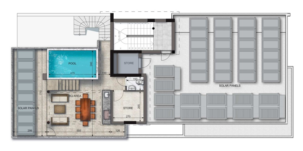 - 3-й этаж: пентхаус с 3 спальнями, террасой на крыше и бассейном