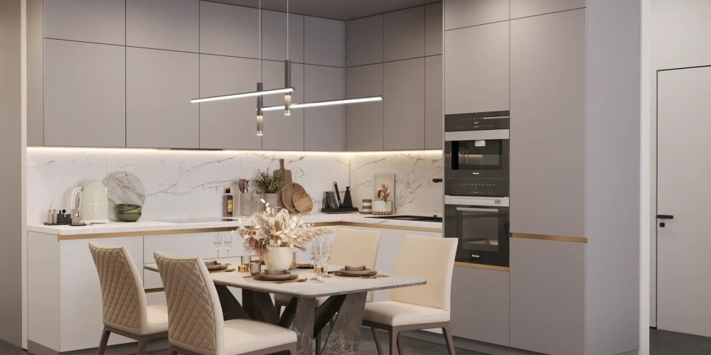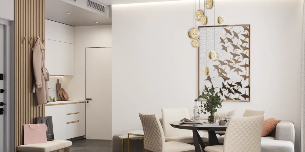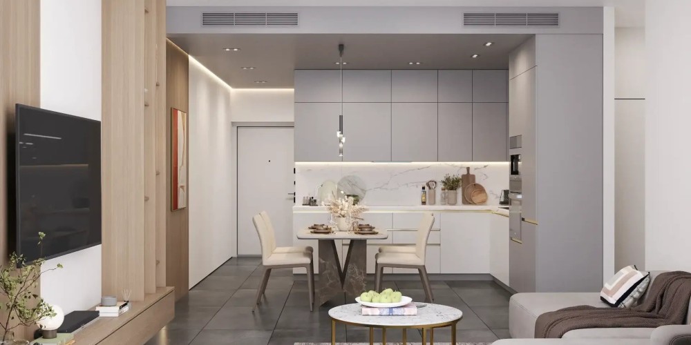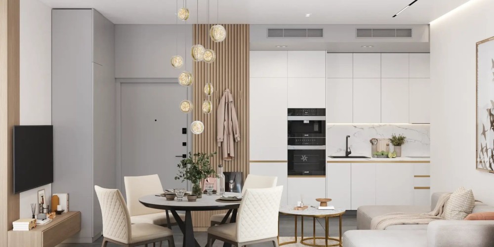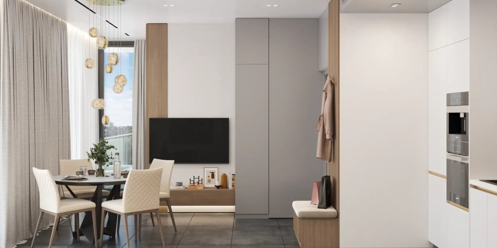- Открытая планировка: кухня, гостиная и столовая
